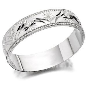 The ring is diamond cut or engraved with unique patterns to add detail.