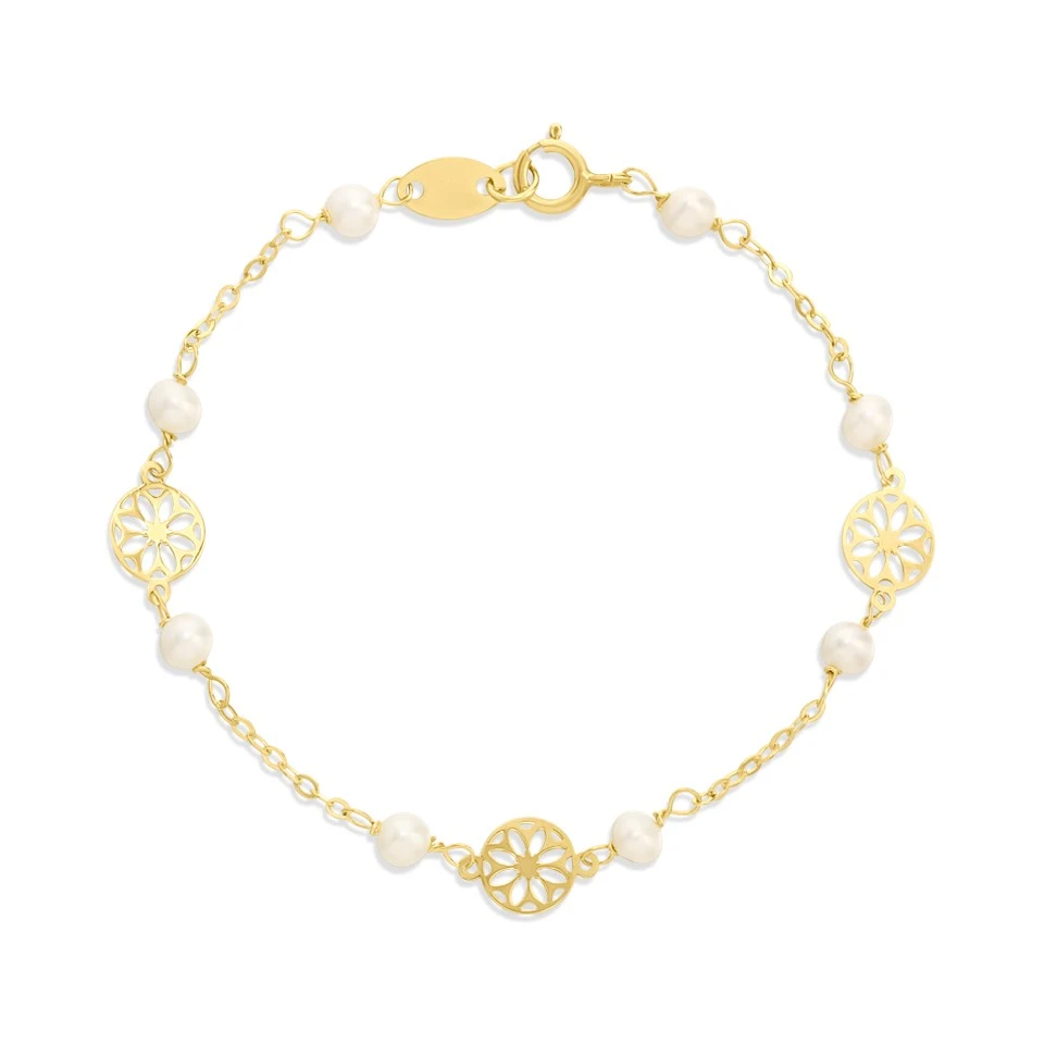14ct Gold Pearl And Disc Children's Bracelet 5in - G1346