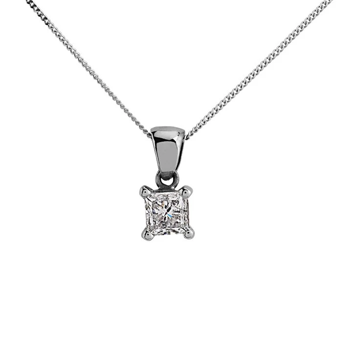 Expertly crafted in 18ct white gold in our UK workshop, this pendant showcases a princess cut, ethically sourced natural diamond, designed to capture and reflect light with every movement.