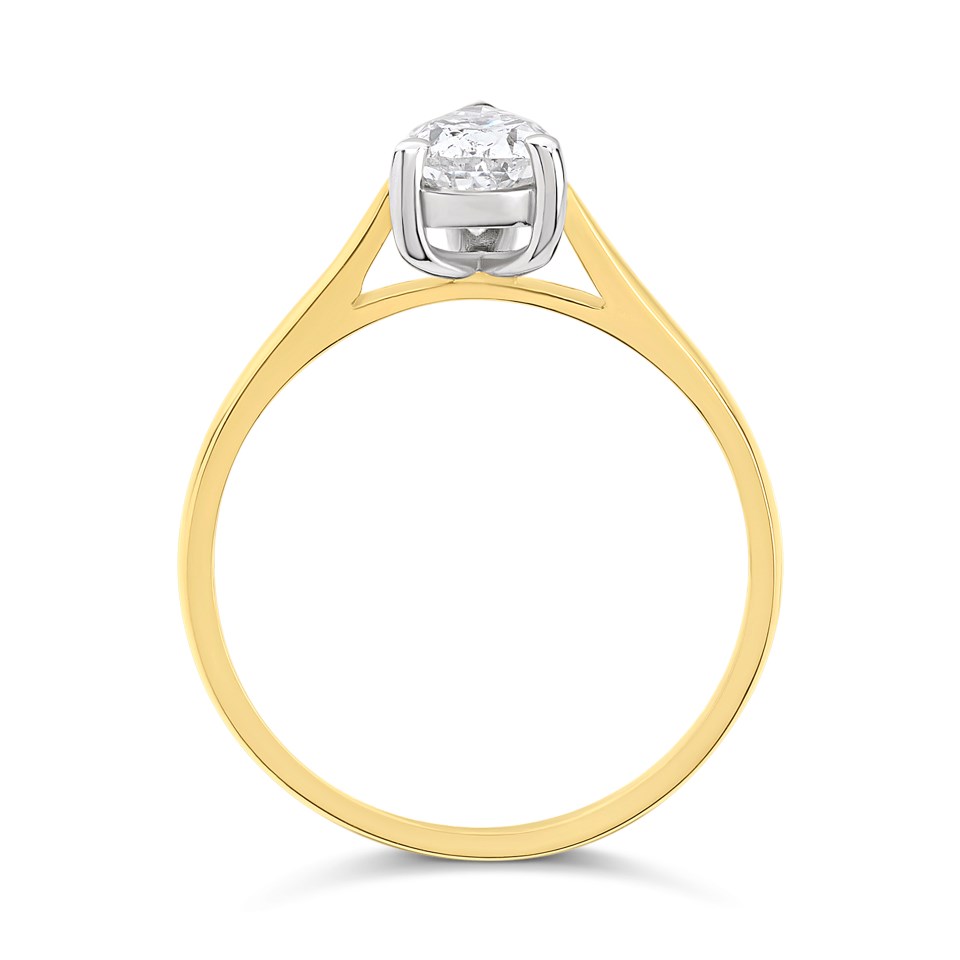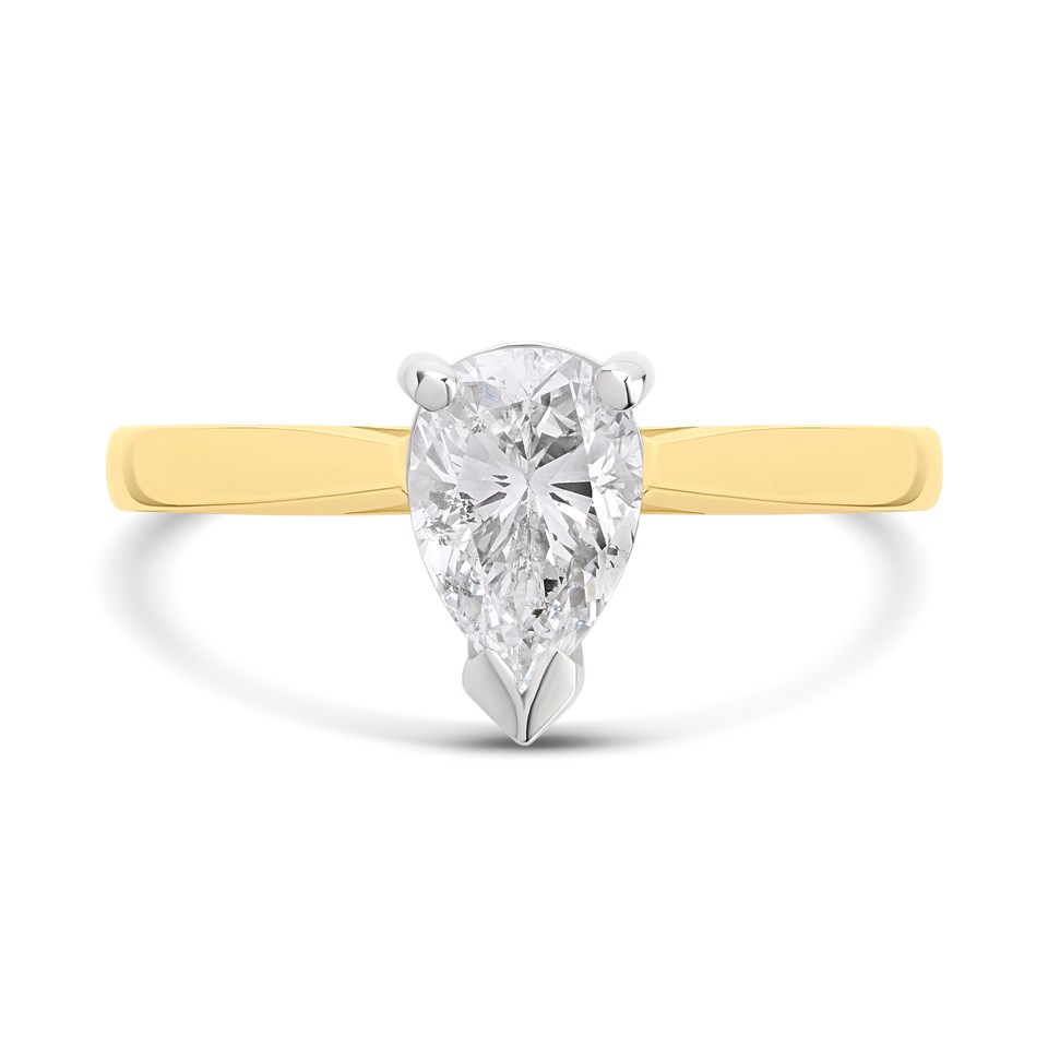 Celebrate your love with the stunning Solitaire Diamond Engagement Ring, a symbol of timeless elegance and commitment. Featuring a single, pear cut diamond, this classic design is crafted to perfection in our UK workshop. The polished 18ct yellow gold solitaire setting elegantly showcases the diamond, allowing its natural sparkle to shine through with every movement.