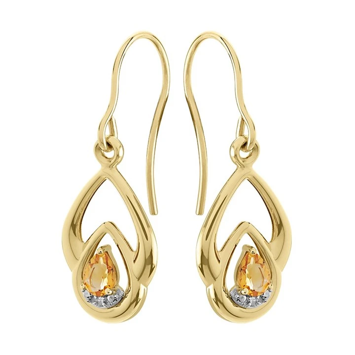 9ct Gold Citrine And Diamond Hook Wire Earrings - 28mm drop - G1840