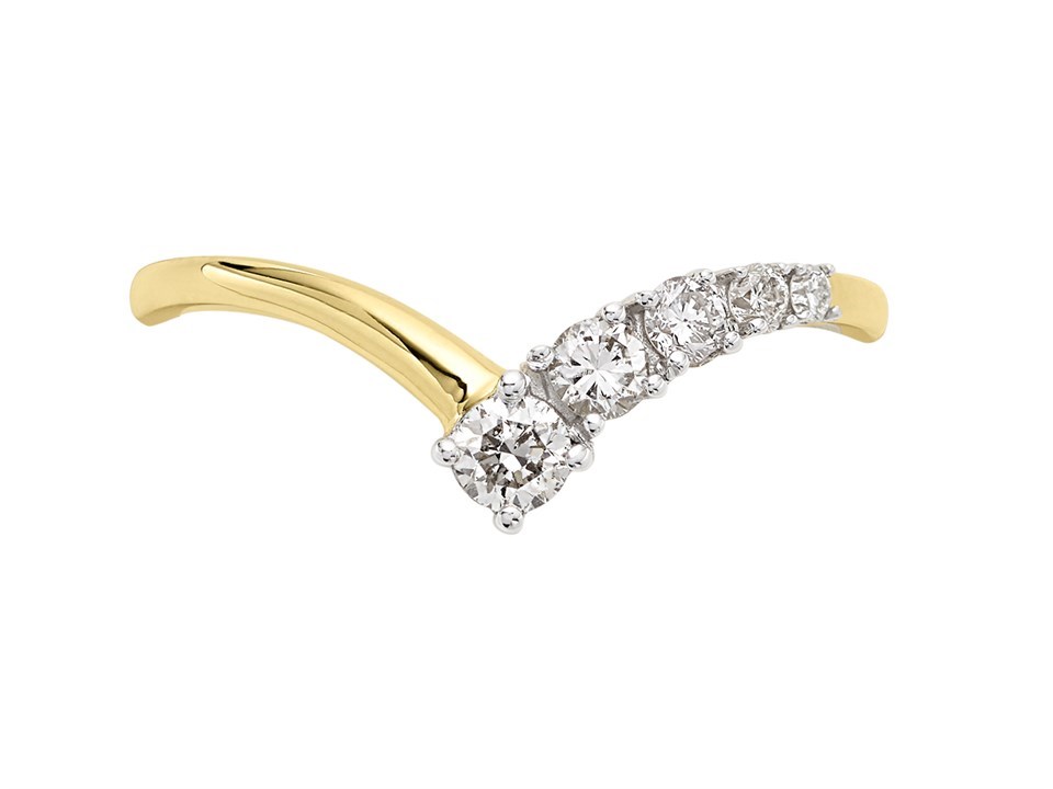 Diamond wishbone rings look lovely worn singly - as an alternative to a diamond eternity ring - but are usually selected to fit round an engagement ring, creating a perfectly shaped diamond set wedding ring. Usually with the point or curve worn towards the heart, they are romantic and symbolic.