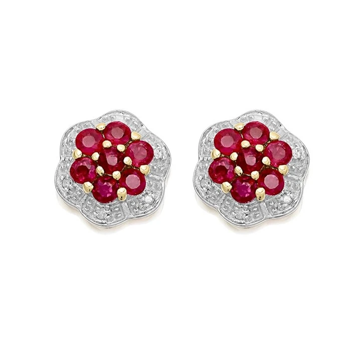 9ct Gold Ruby And Diamond Flower Cluster Stud Earrings - D54127
