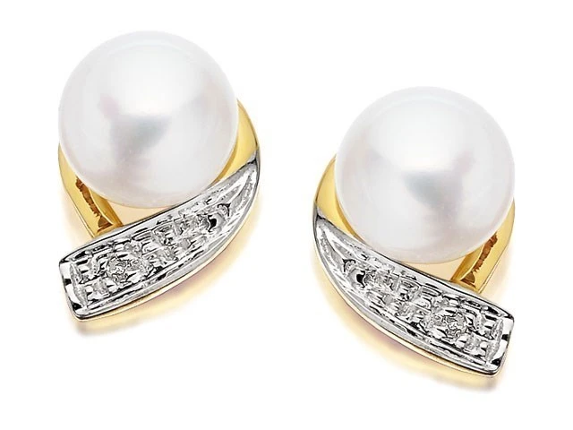 9ct Gold Two Colour Diamond And Freshwater Pearl Earrings - 10mm - G0620