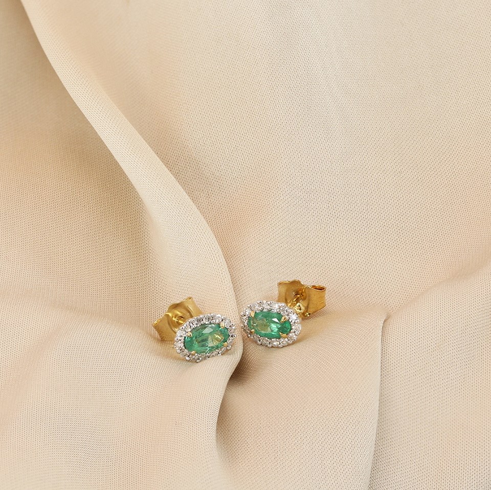 9ct Oval Emerald And Diamond Cluster Stud Ring - D96119