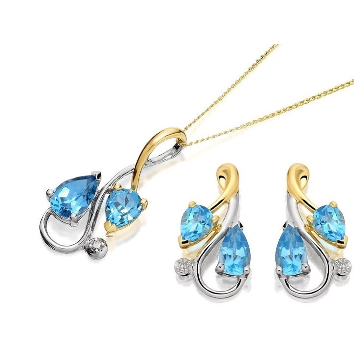 9ct Two Colour Gold Blue Topaz And Diamond Stud Earring And Pendant Set - GS0684