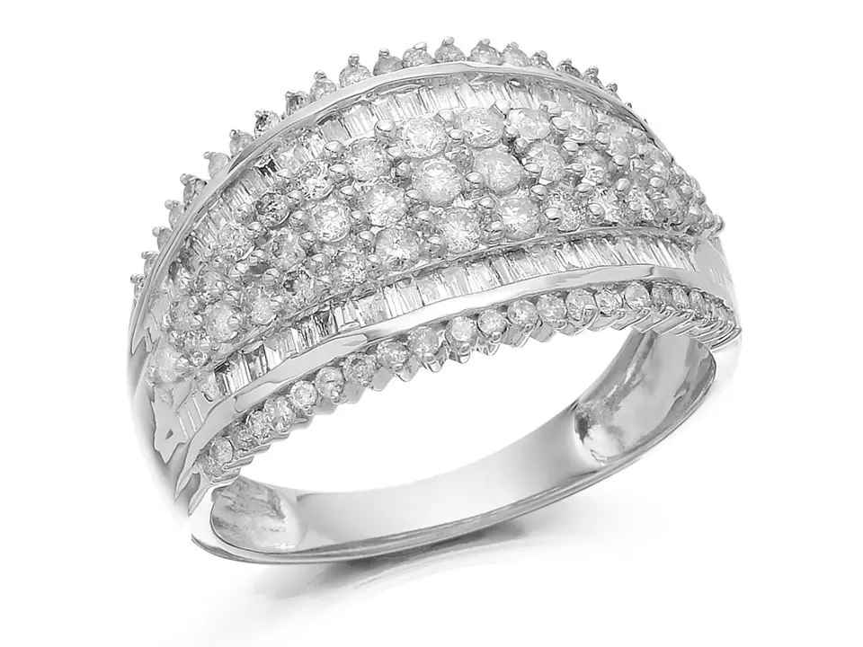 Similar to dress rings, wide band rings are usually worn for special occasions and offer an alternative to the slimmer, single row eternity ring. As band rings are often wider than the average engagement, eternity or dress ring, we recommend selecting at least one ring size larger than usual to accommodate the wide setting.