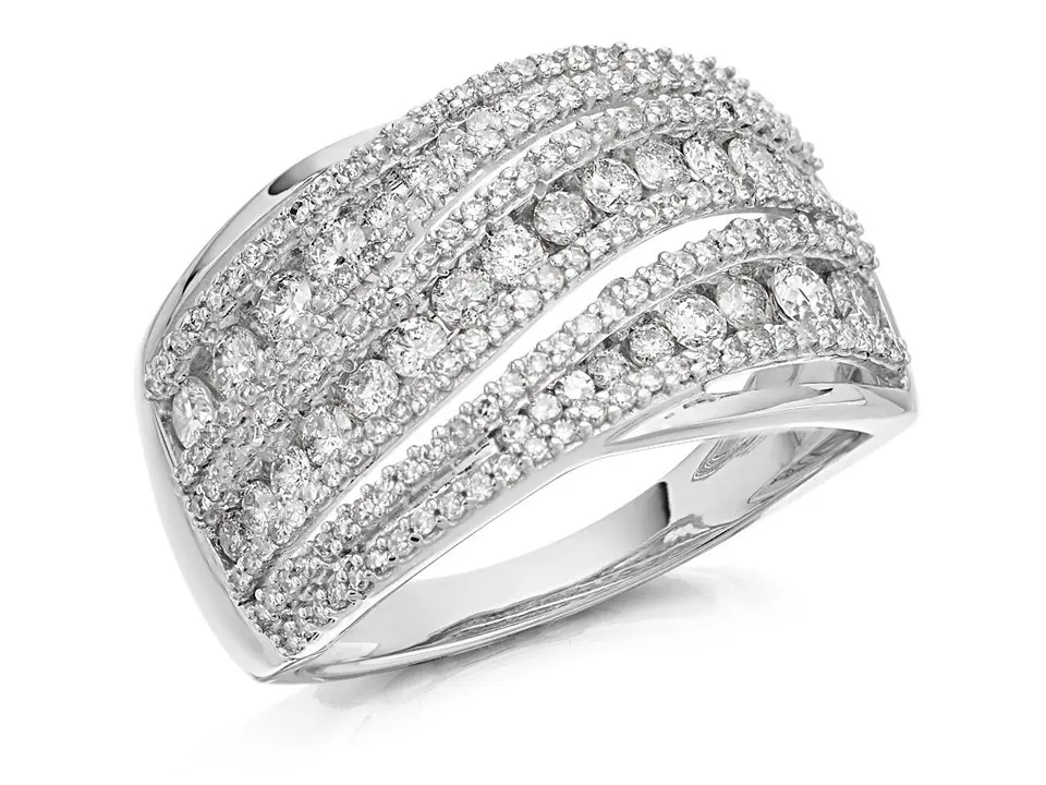 Similar to dress rings, wide band rings are usually worn for special occasions and offer an alternative to the slimmer, single row eternity ring. As band rings are often wider than the average engagement, eternity or dress ring, we recommend selecting at least one ring size larger than usual to accommodate the wide setting.