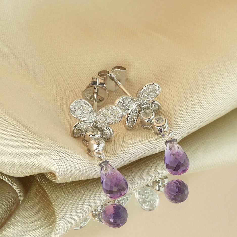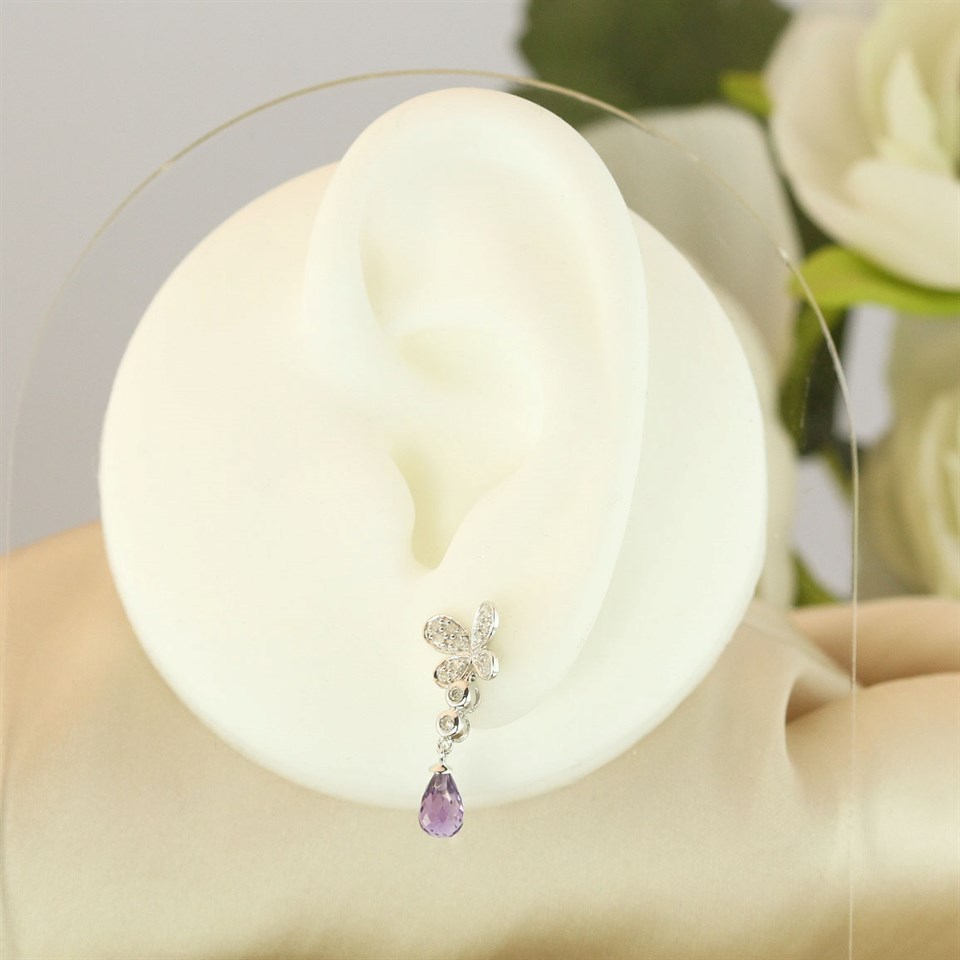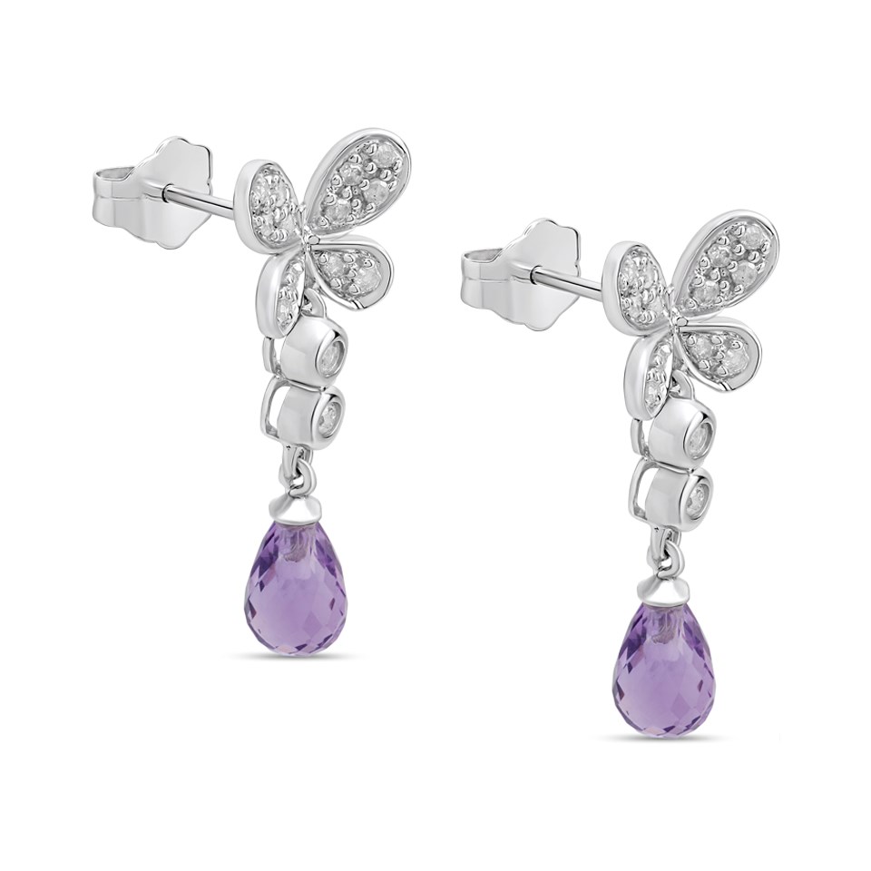 9ct White Gold Amethyst And Diamond Butterfly Drop Earrings - D9694