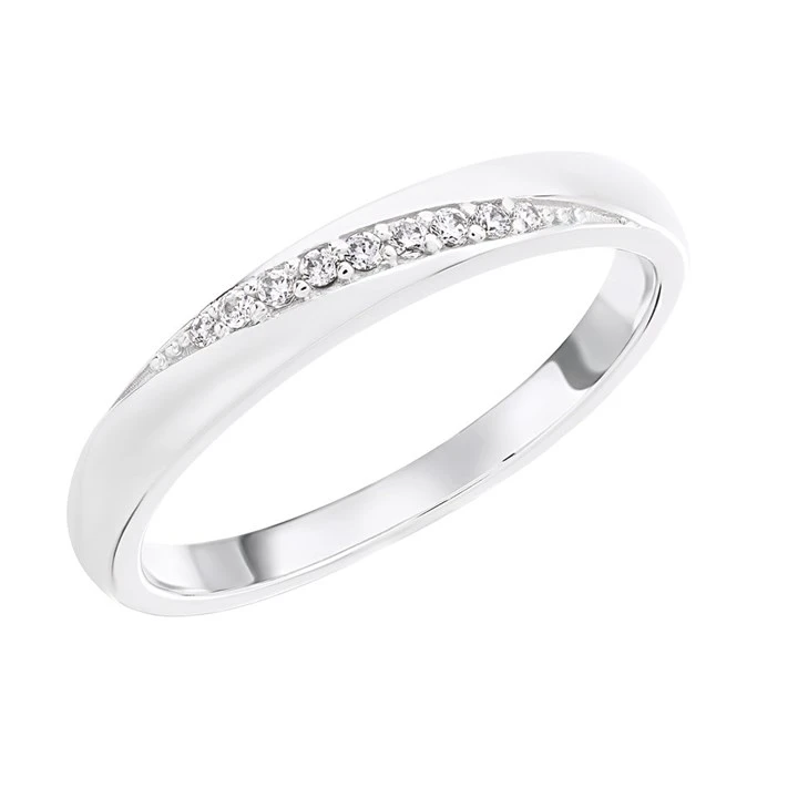 With a diagonal flash of diamonds across the 2.5mm wide rounded white gold band, this lovely wedding ring fits perfectly alongside matching diamond engagement ring D5259 to make a lovely bridal set. Total diamond weight 5pts, diamonds graded colour G-H and clarity I1.