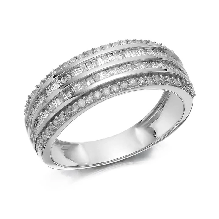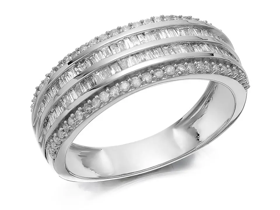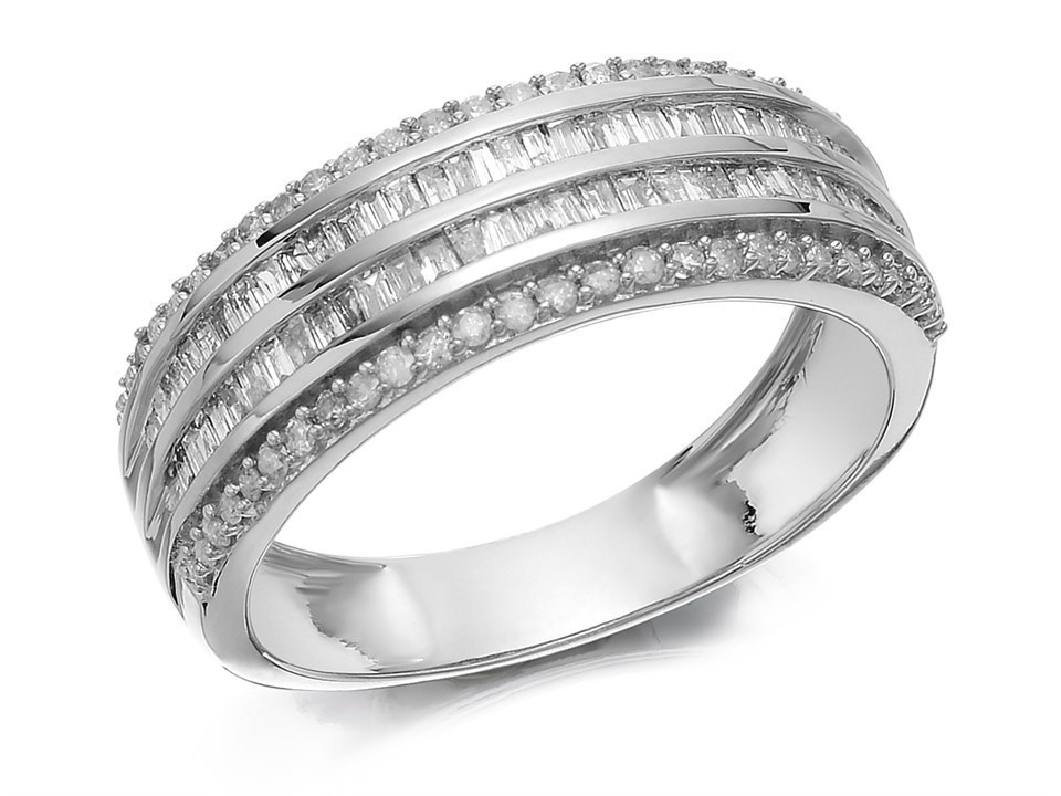 Similar to dress rings, wide band rings are usually worn for special occasions and offer an alternative to the slimmer, single row eternity ring. As band rings are often wider than the average engagement, eternity or dress ring, we recommend selecting at least one ring size larger than usual to accommodate the wide setting.