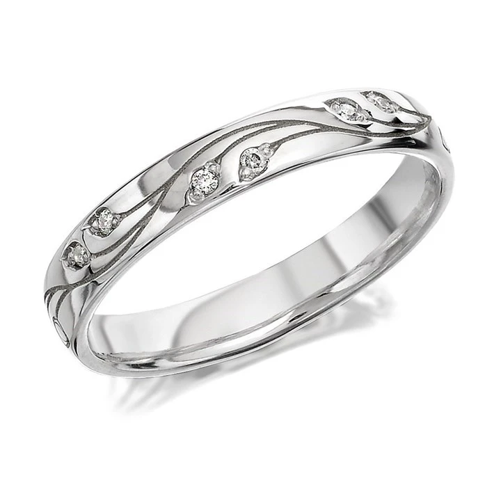 9ct White Gold Diamond Set Leaf Wedding Ring - 3mm - R2434