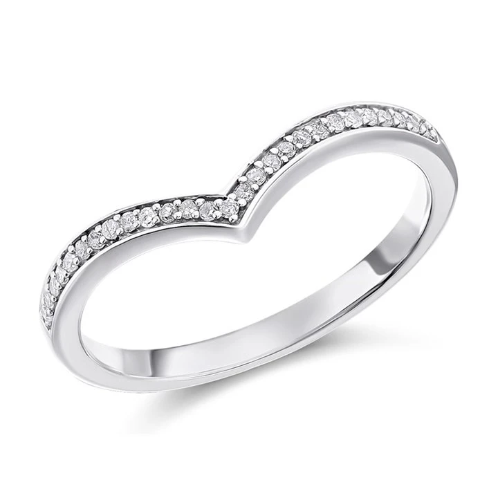 Diamond wishbone rings look lovely worn singly - as an alternative to a diamond eternity ring - but are usually selected to fit round an engagement ring, creating a perfectly shaped diamond set wedding ring. Usually with the point or curve worn towards the heart, they are romantic and symbolic.