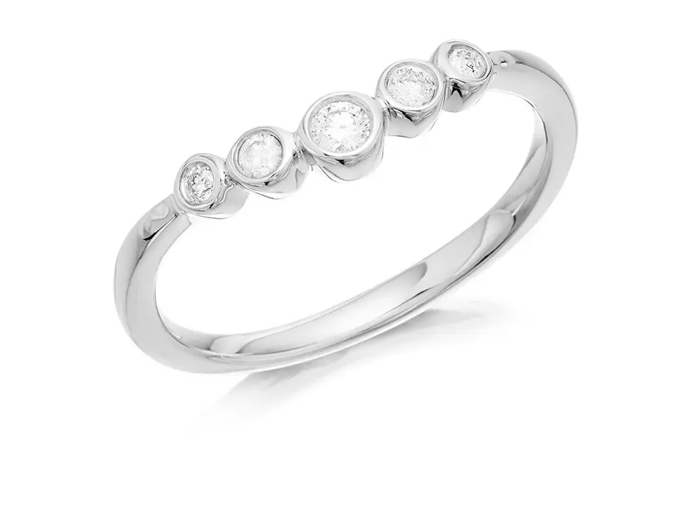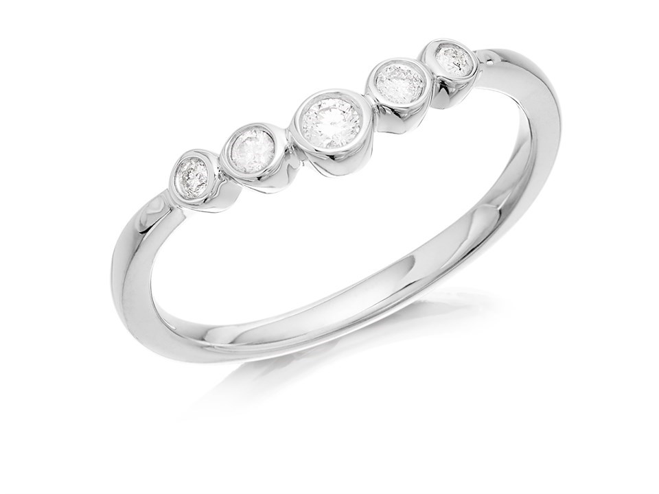 Five stone rings look lovely on the finger and are a cross between a half eternity ring and a wider band ring. Often chosen as an engagement ring and stretching perfectly across the width of the finger, they are usually set with diamonds and precious gemstones.