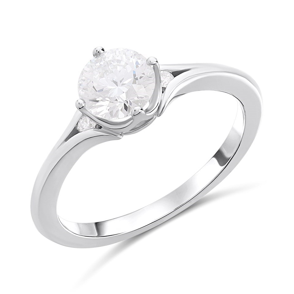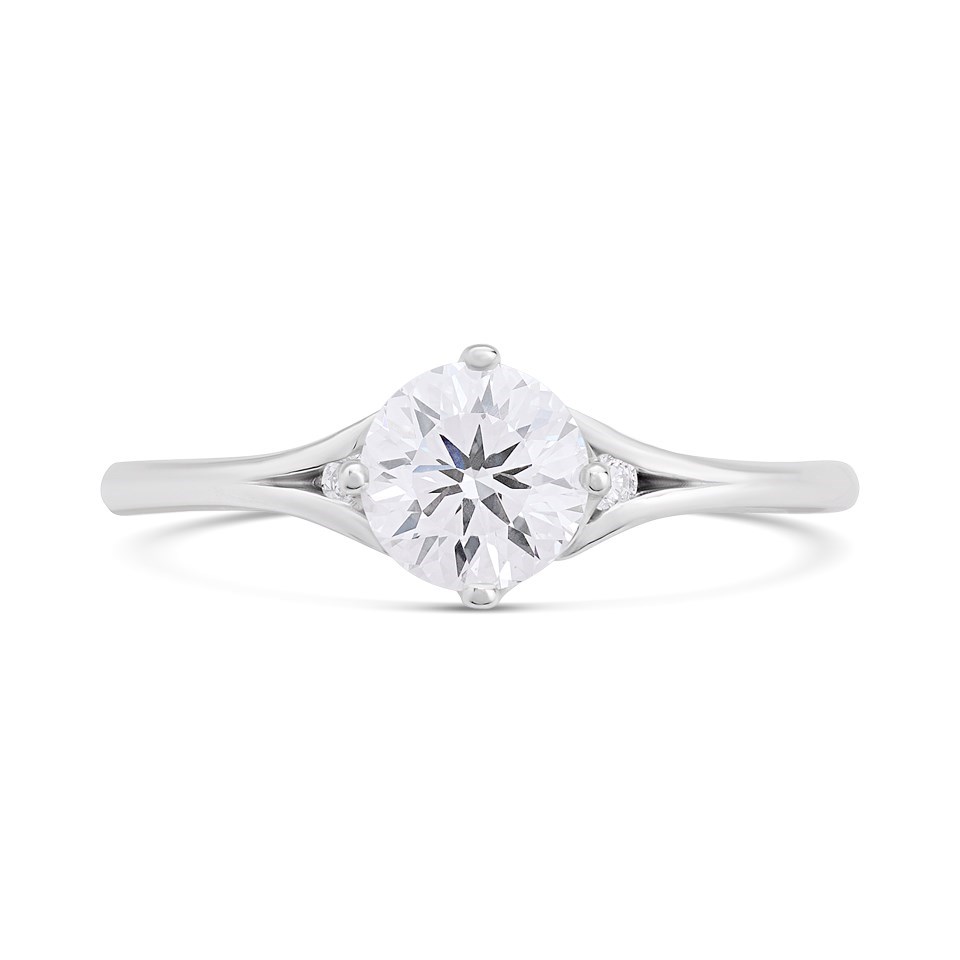 This 4-claw round-cut singlestone ring from the Blossom Collection of Lab Grown Diamonds features a central round stone set with two smaller stones on the shoulders for added interest.