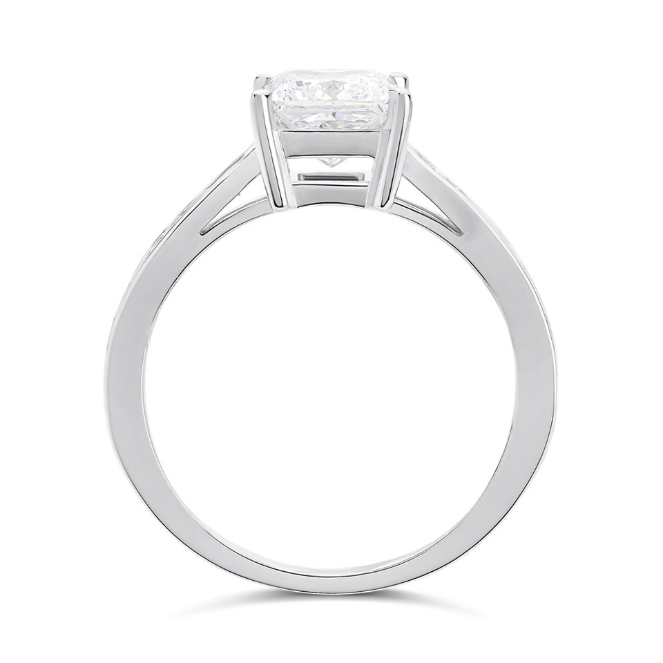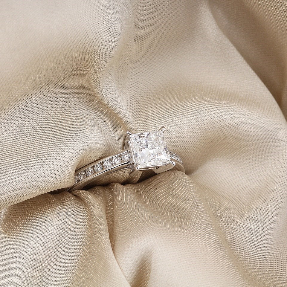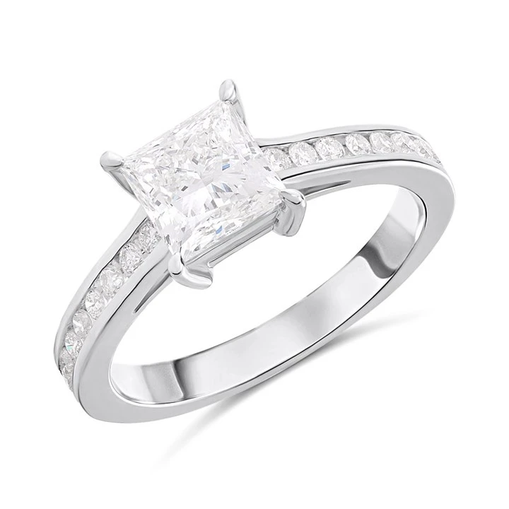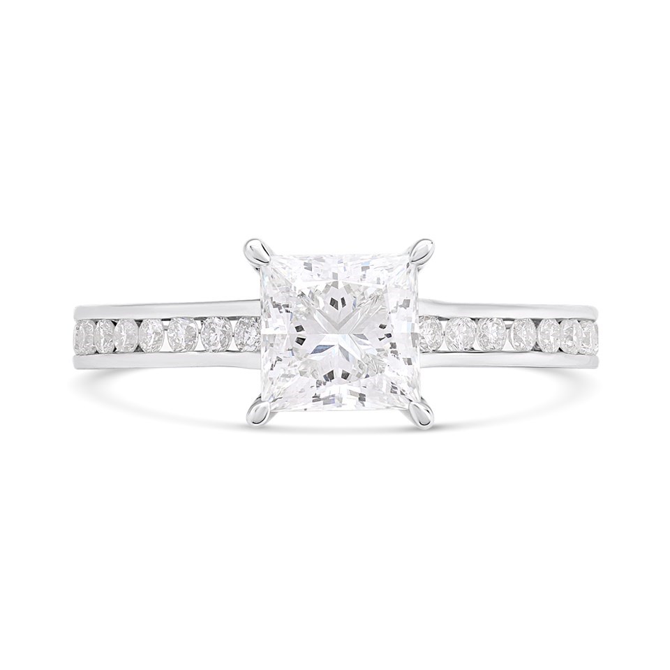 This stunning singlestone ring from the Blossom Collection of Lab Grown Diamonds features a central princess-cut stone with additional round cut stones on the shoulders.