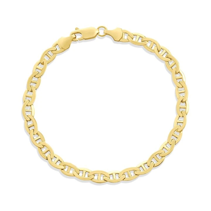 This gold anchor bracelet is 5mm wide and 7.5" long.