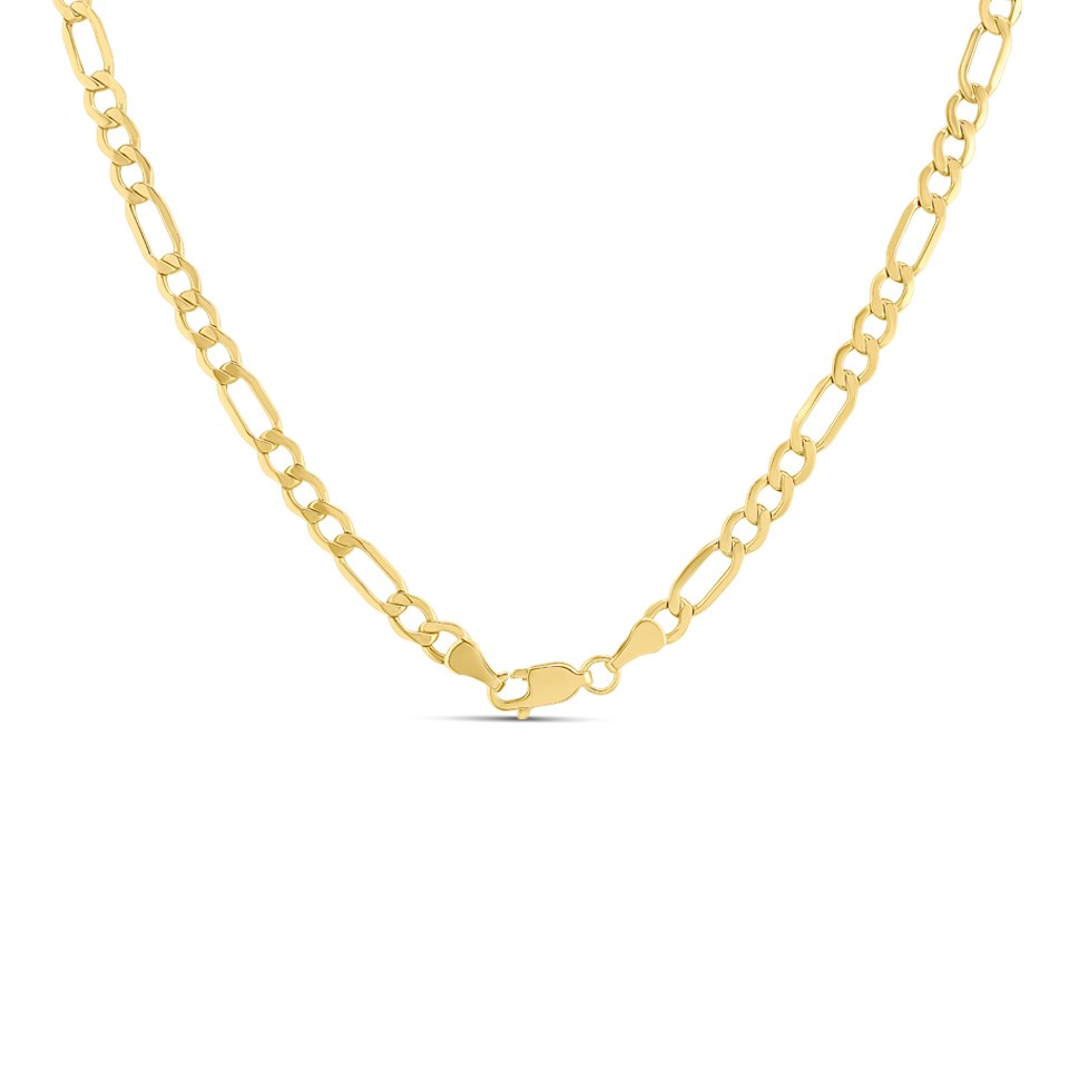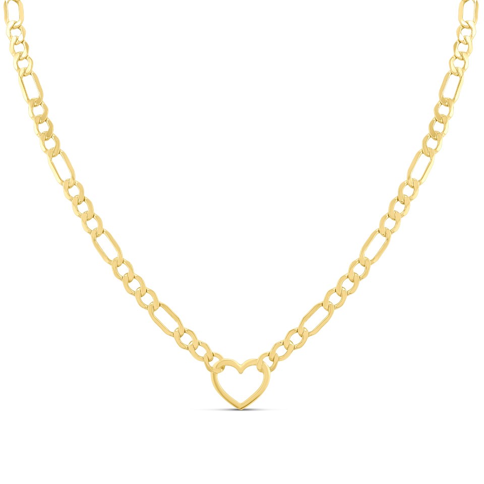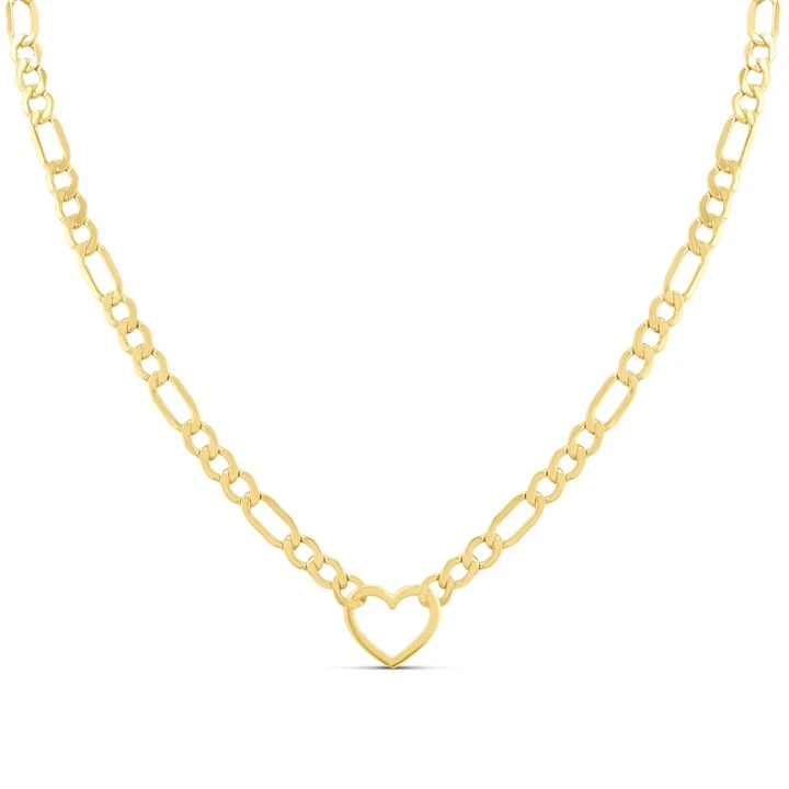 This feature heart figaro necklet features 4mm wide links, measures 17in long and is fitted with a secure karab clasp.