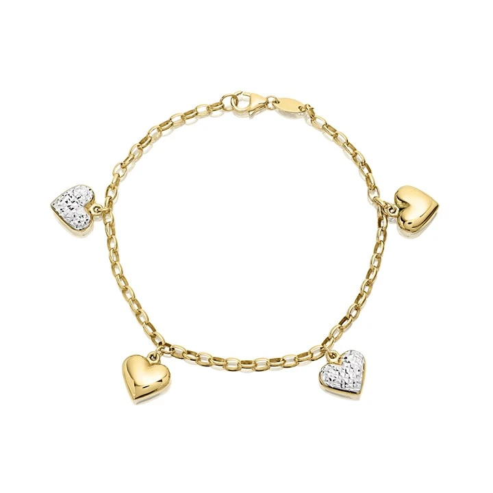 This piece features alternating two tone and yellow gold hearts set along a trace link chain to create a 7.5in long charm bracelet.