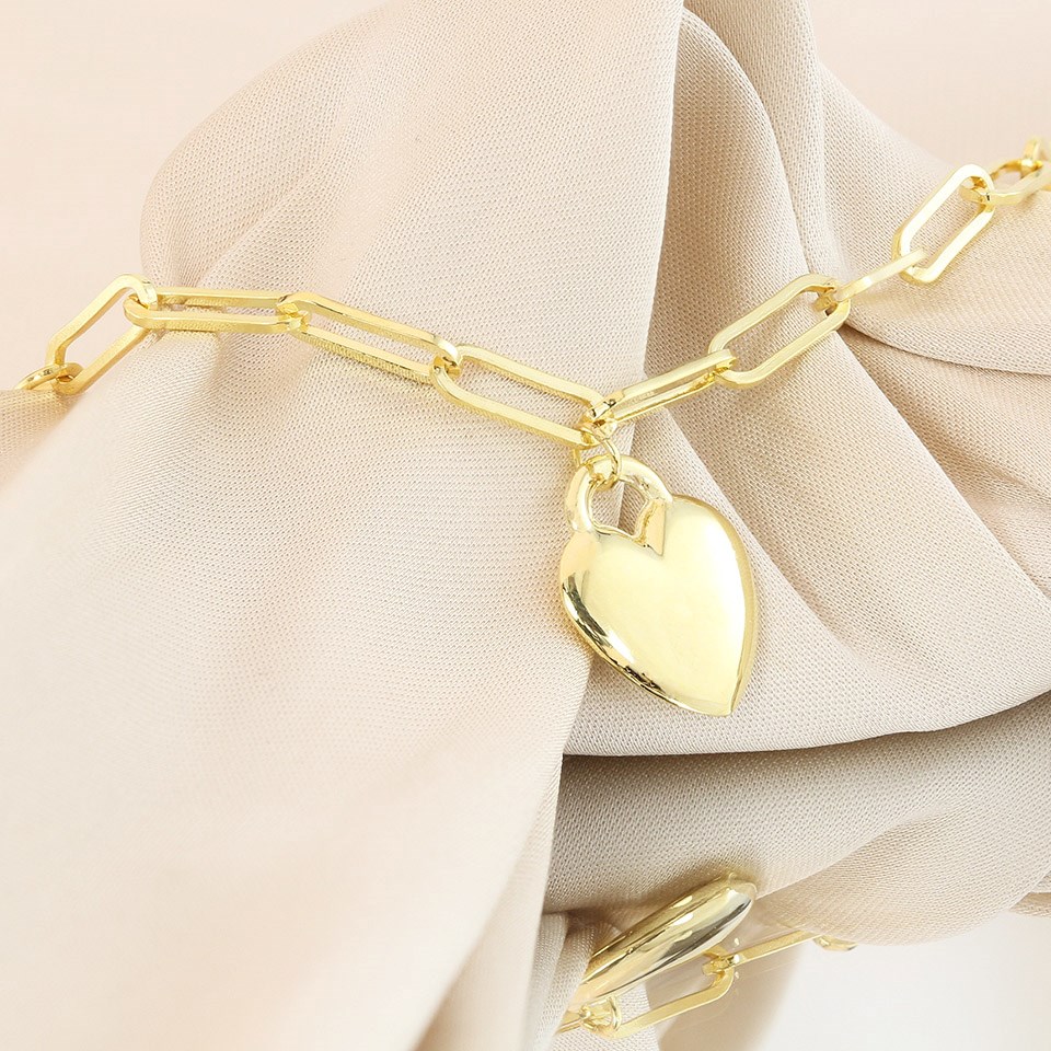 This open link bracelet has an 11mm wide heart charm with a karab clasp and measures 7.5in/19cm.