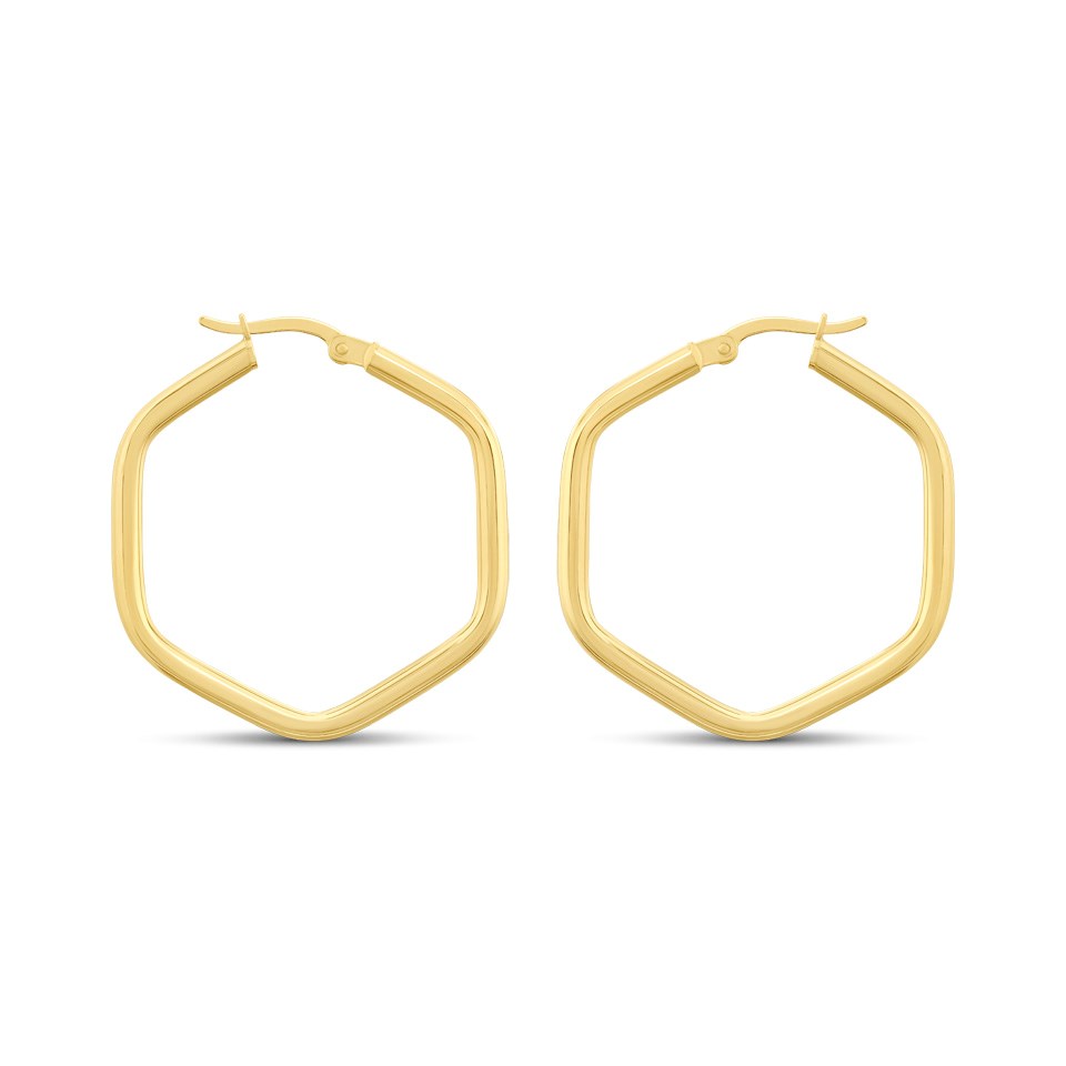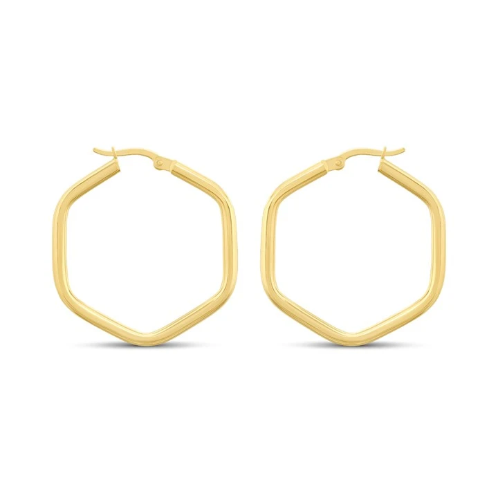 Contemporary, hexagonal shaped hooped earrings with an approximate width of 30mm.