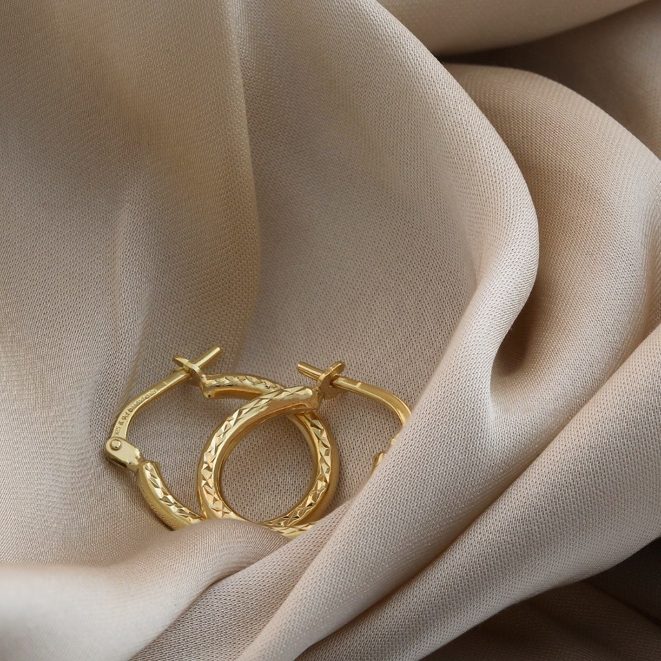 These smaller, faceted hoop earrings measure 15mm wide.
