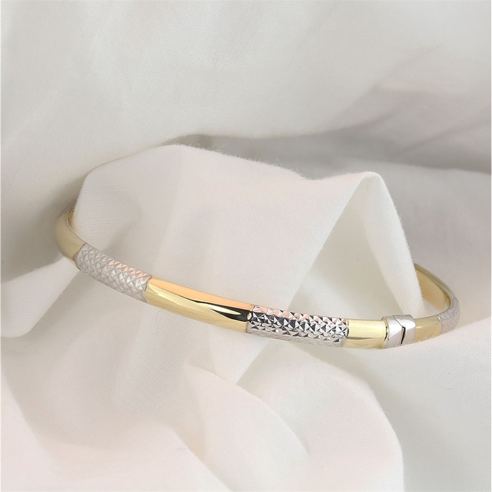 This 4.75mm wide diamond cut two-colour hinged bangle has two clips to give a secure fitting.