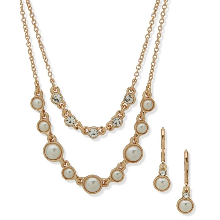Anne Klein Gold Tone Simulated Pearl And Crystal Necklace And Earrings Set - J78421