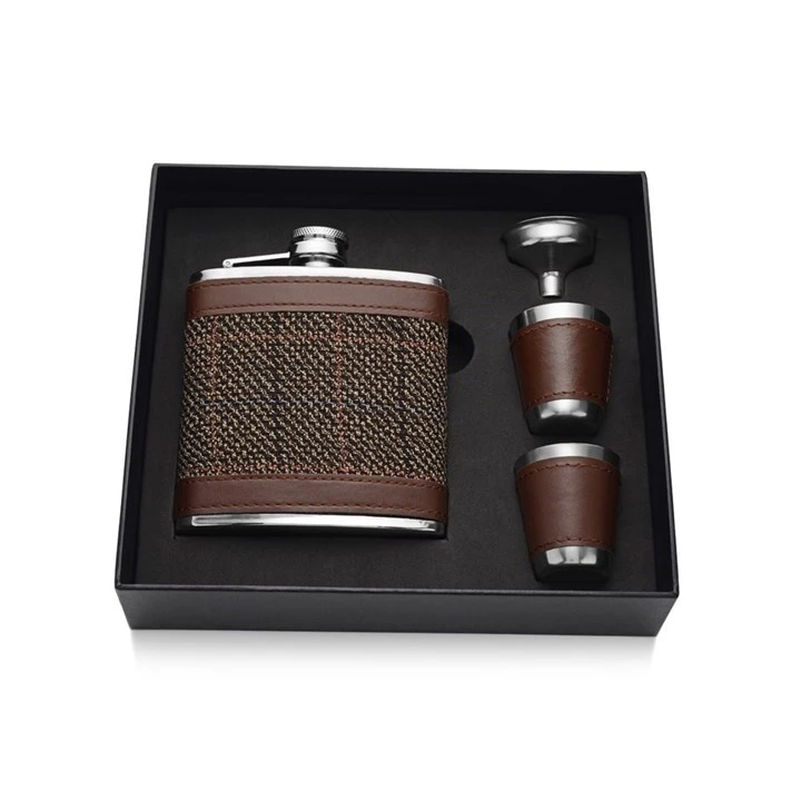 Brown Tweed 6oz Hip Flask, Two Nip Cups And Funnel Gift Set - A3121