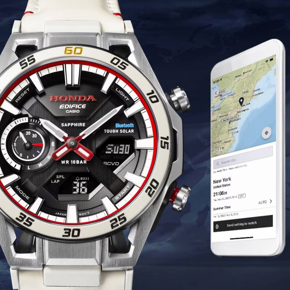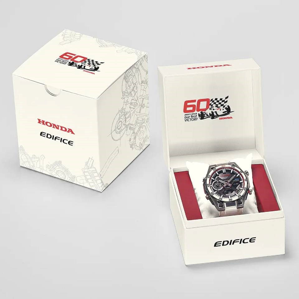 The EDIFICE design team worked closely with Honda, studying every detail of the RA272, the racing legend that sped to victory in the 1965 Mexican Grand Prix, to capture the spirit and engineering of this iconic car. Painted in authentic Championship White, the bezel takes on the exact colour of the RA272, marking the first time the car’s distinctive hue has been applied to a watch exterior. The dial features the number “60” engraved in gold tones at the 60-minute mark to honour the anniversary of this historic victory, and the dial ring in red expresses the Hinomaru design painted on the body of the RA272.