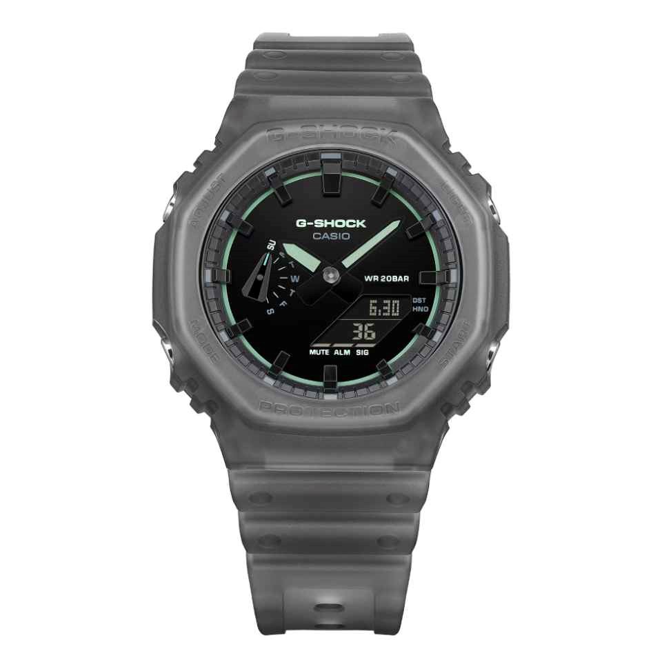 A newly engineered surface finish gives the dial a crisp, refined aesthetic that pairs effortlessly with the clean lines of the GA-2100. This smooth foundation sets the stage for a high-gloss sheen and a deep, piano-black colour palette. Contrasting textures and tones across the watch echo the late-night music scene, whilst neon accents gleam like laser flashes. The matte translucent bezel and band offer a tactile feel reminiscent of dance-floor haze drifting from a fog machine. A bold new expression: forward-thinking design fused with signature G-SHOCK toughness.