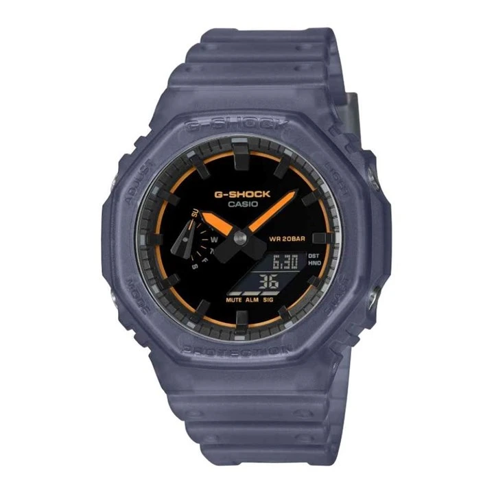 A newly engineered surface finish gives the dial a crisp, refined aesthetic that pairs effortlessly with the clean lines of the GA-2100. This smooth foundation sets the stage for a high-gloss sheen and rich blue colour palette. Contrasting textures and tones across the watch echo the late-night music scene. Neon orange accents gleam like laser flashes, while the matte, translucent bezel and band offer a tactile feel reminiscent of dance-floor haze drifting from a fog machine. A bold new expression: forward-thinking design fused with signature G-SHOCK toughness.