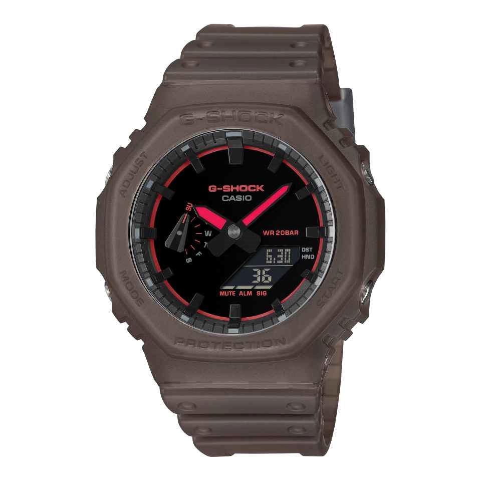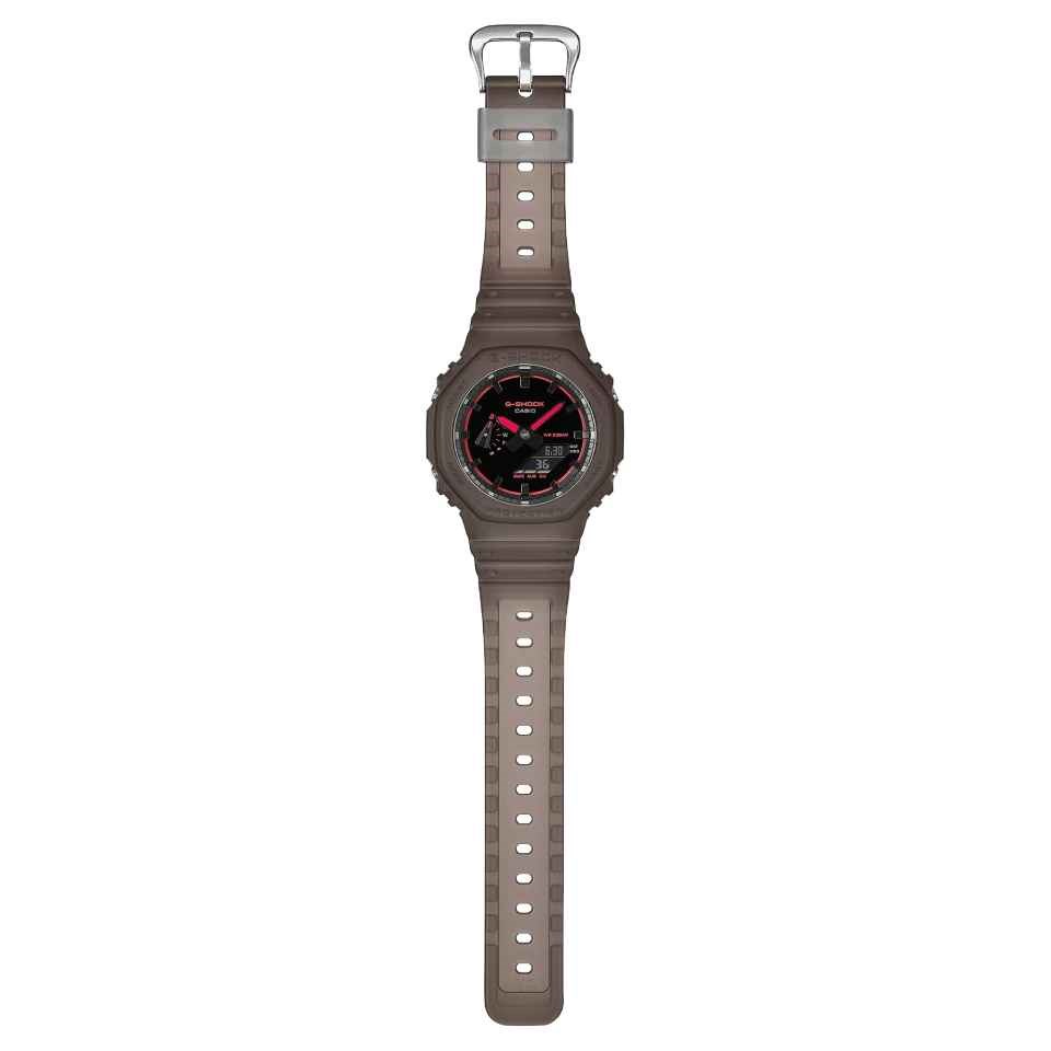 A newly engineered surface finish gives the dial a crisp, refined aesthetic that pairs effortlessly with the clean lines of the GA-2100. This smooth foundation sets the stage for a high-gloss sheen and rich chocolate brown colour palette. Contrasting textures and tones across the watch echo the late-night music scene. Neon pink accents gleam like laser flashes, while the matte, translucent bezel and band offer a tactile feel reminiscent of dance-floor haze drifting from a fog machine. A bold new expression: forward-thinking design fused with signature G-SHOCK toughness.