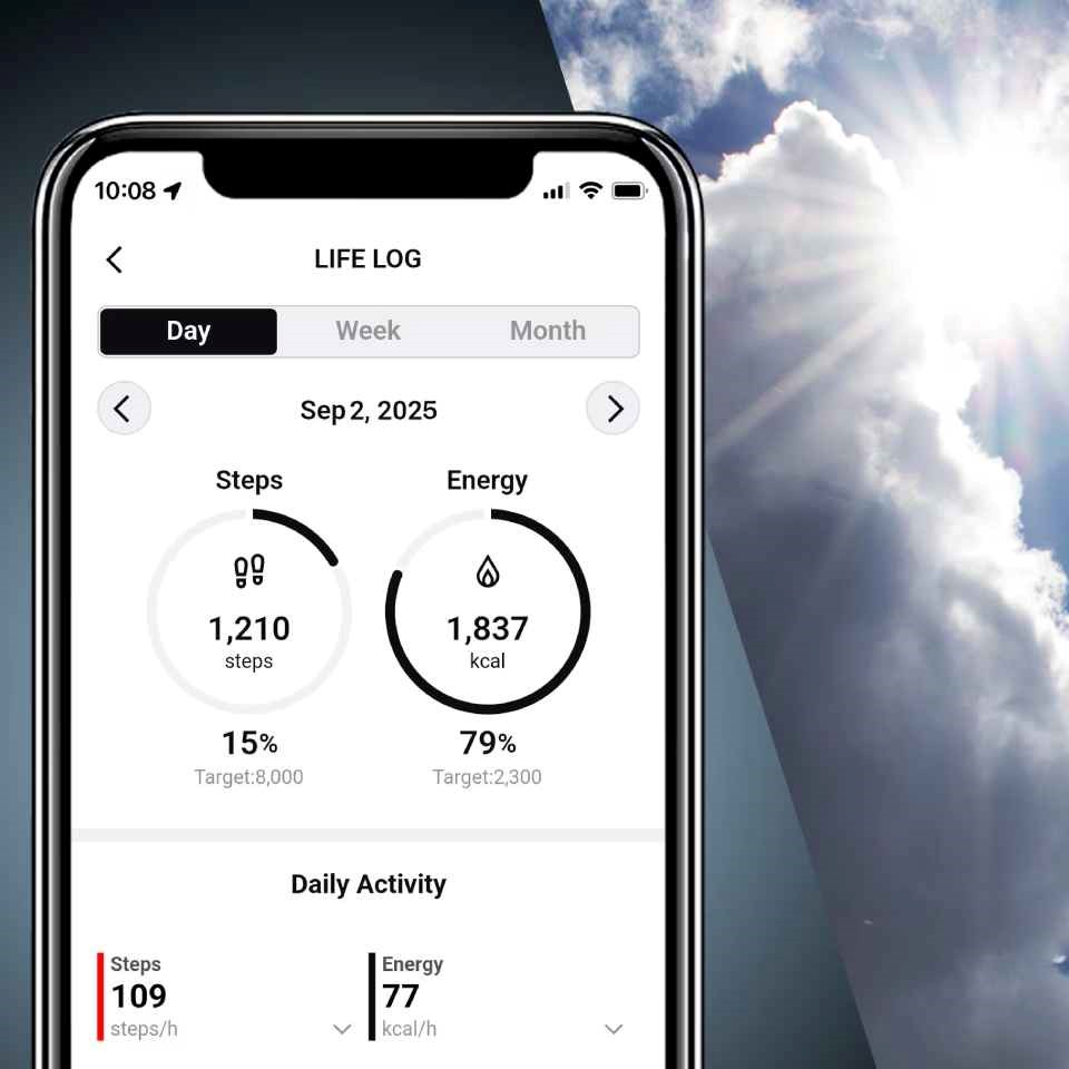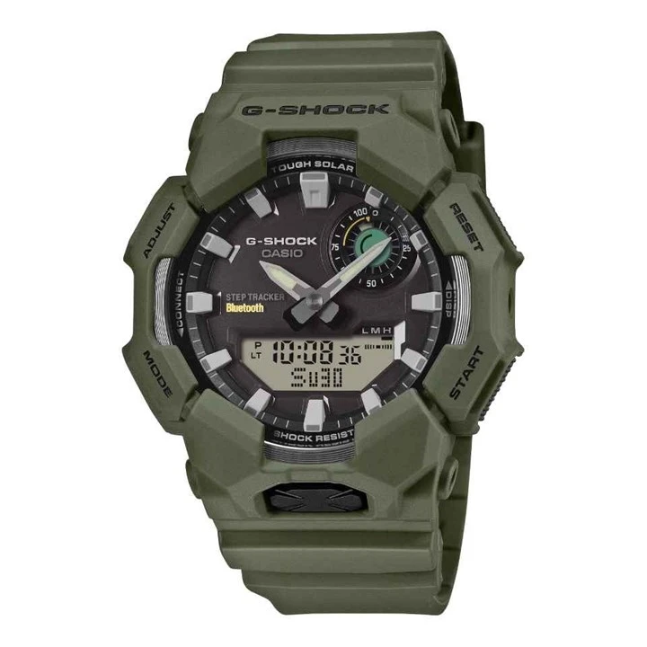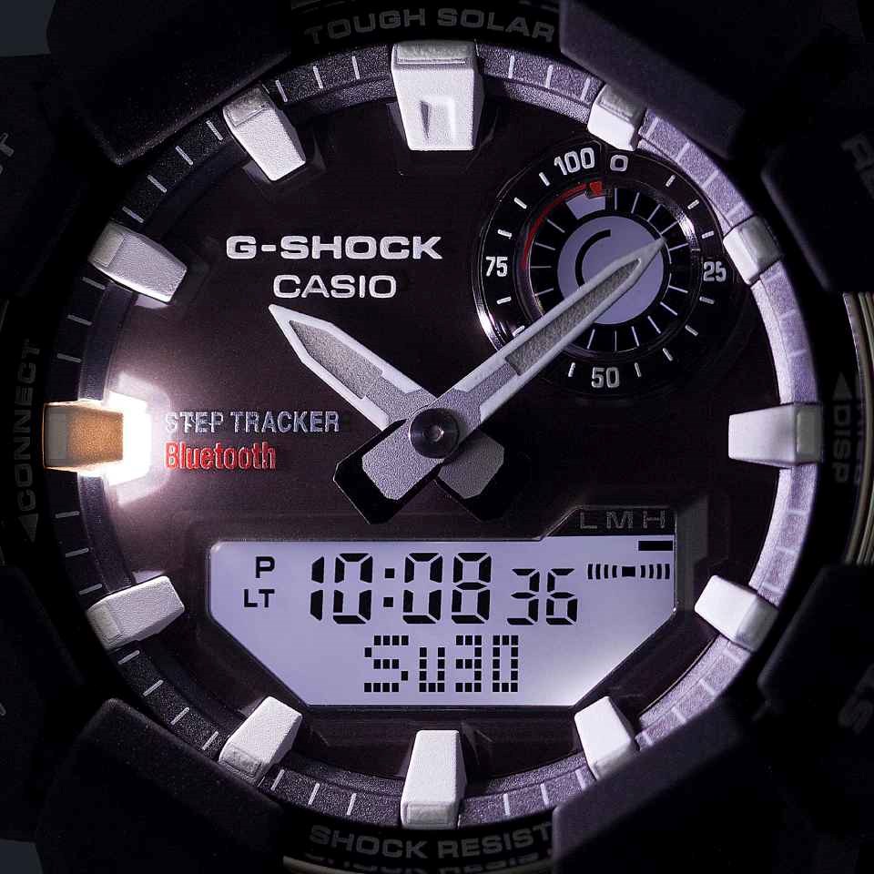 This G-SHOCK watch requires only solar power to count steps and display tracked data on the digital display. The watch also sends data to a paired smartphone via Bluetooth®, for full functionality at your fingertips. Simply tap into the CASIO WATCHES app for automatic precision timekeeping and to easily manage life logs from your phone. The watch delivers handy features like world time and stopwatch, as well as a high-brightness LED light that can be turned on and off using the large button on front of the case. Indexes and watch hands with phosphorescent finish ensure visibility even in the dark.