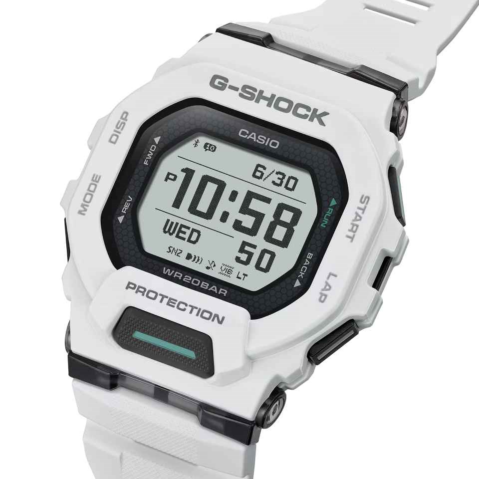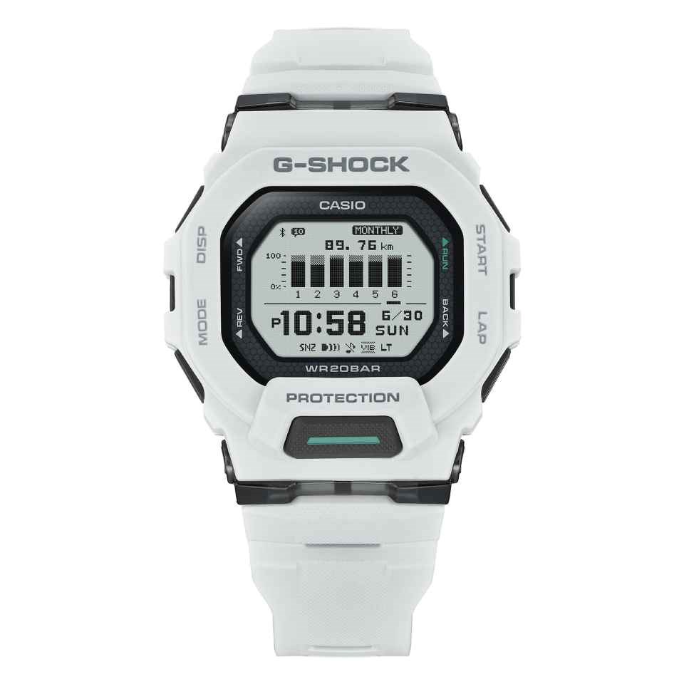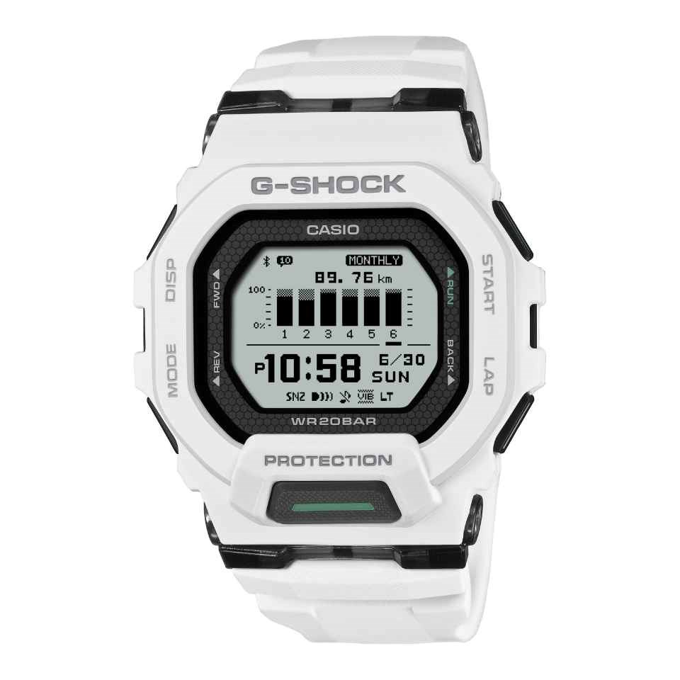 With a 48.4 x 45.9 x 15mm case and a soft, comfortable white urethane strap, the battery is built to last around two years making this watch ready for anything your day brings. The G-SQUAD - tough, functional, and made to move with you. 200m water resistant.