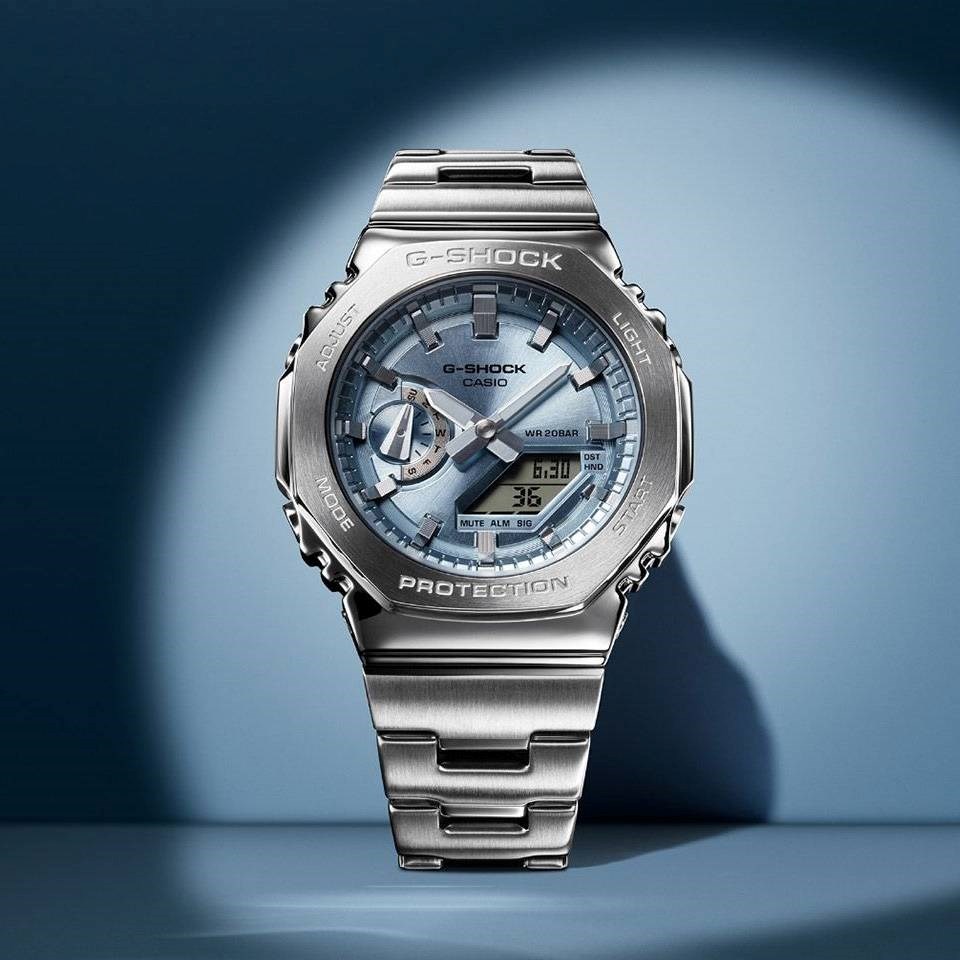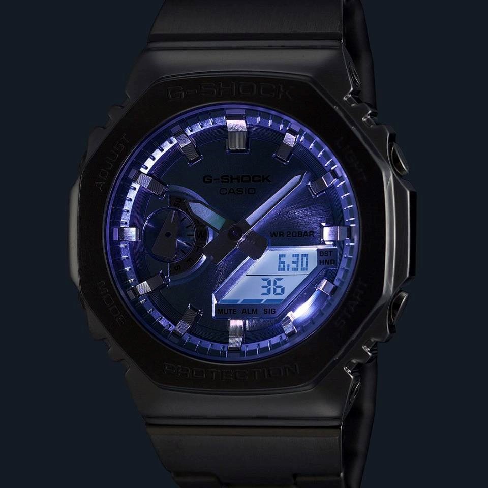 Each GM-2110 is meticulously engineered, featuring an octagonal bezel that is forged, cut and polished to perfection, with individual surfaces finished in distinct hairline and mirror techniques. Paired with a 44.5mm glass fibre-reinforced fine resin case, the result is a slim profile of just 11.8mm making it the thinnest in the G-SHOCK analogue-digital range. The refined metal band ensures you make a statement in any setting, while the high-luminance double LED lighting guarantees visibility at all times. These timepieces effortlessly blend timeless design with contemporary innovation.