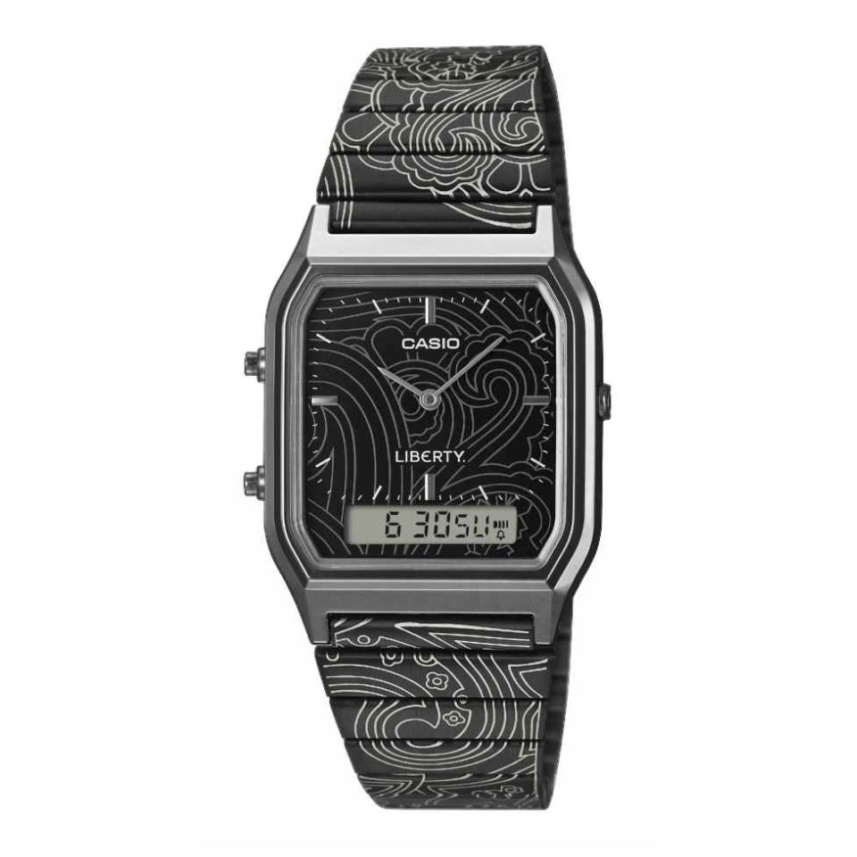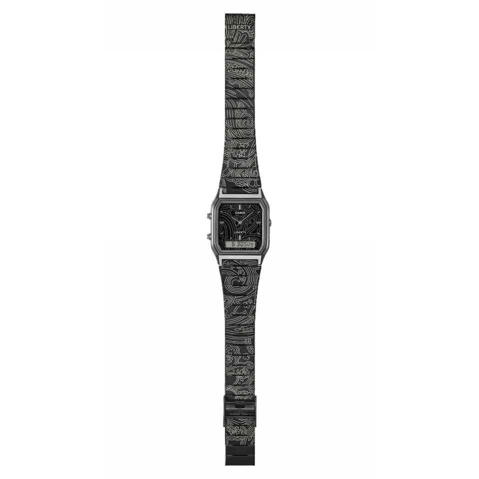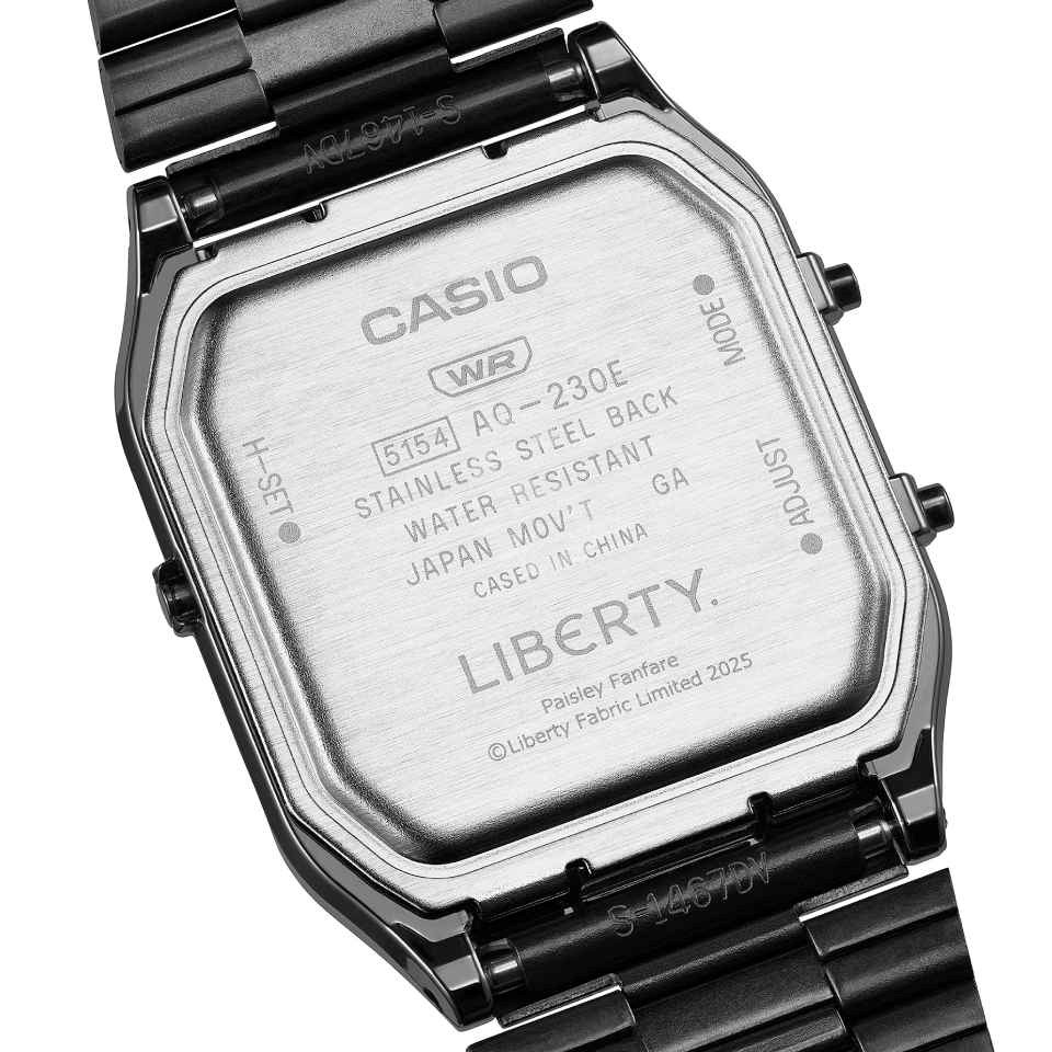 Boasting a 38.8 x 29.8 x 8.1mm black chrome plated resin case and black stainless steel bracelet, it is complete with the Liberty logo engraved on the buckle and case back, plus special packaging designed in a Paisley Fanfare. Meticulous attention to every detail makes this a timepiece worthy of a Casio × Liberty collaboration.