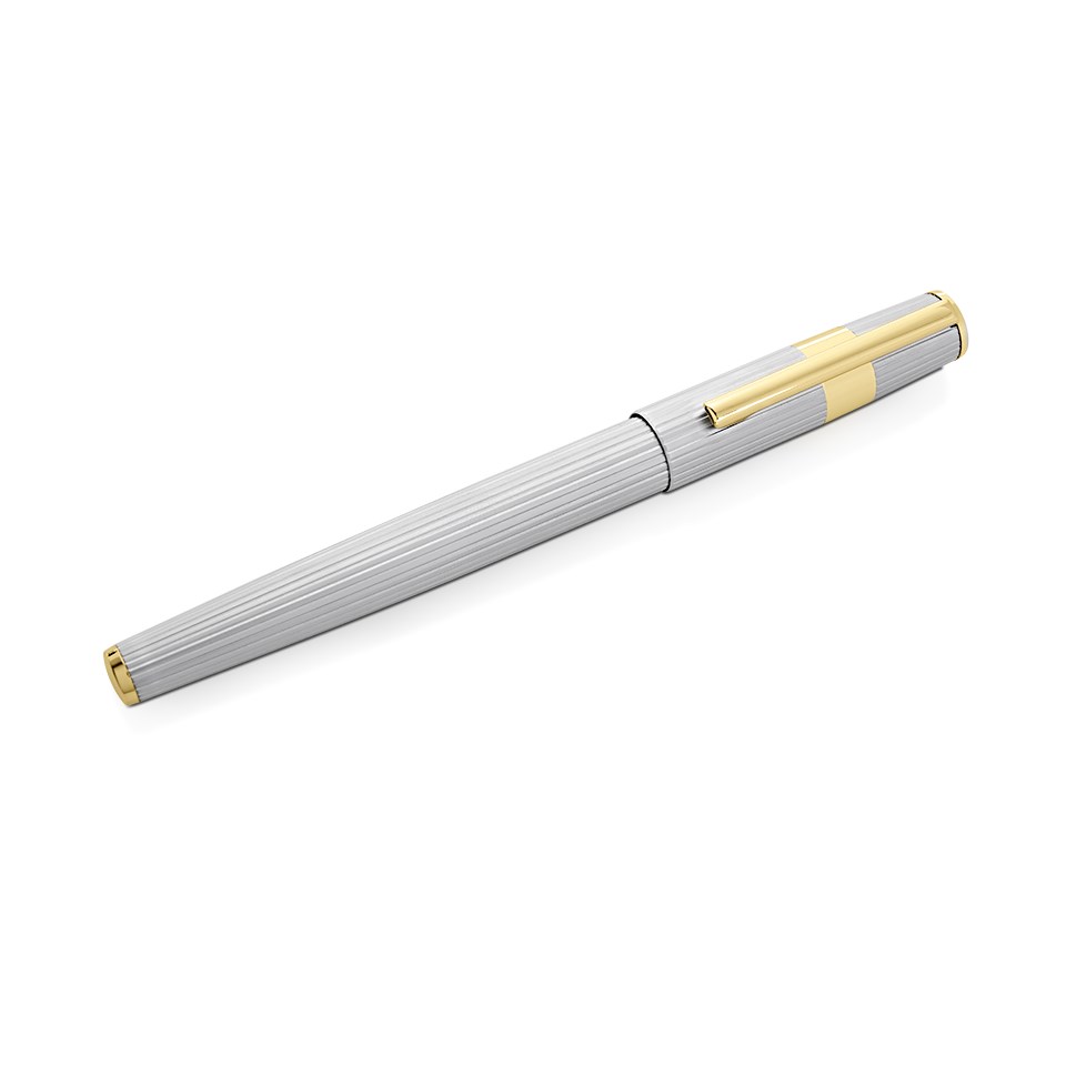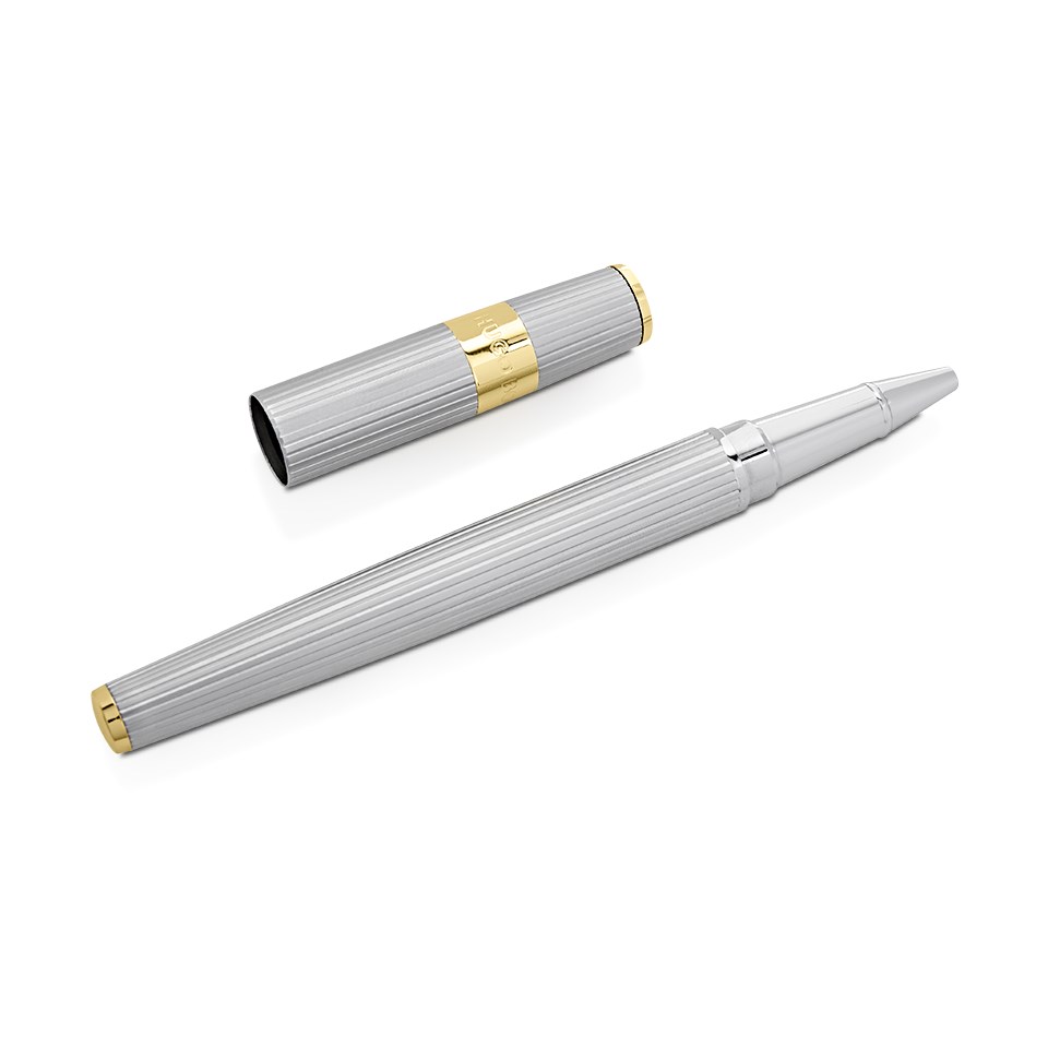 A matt silver finish ribbed case with gold tone detailing for this Hugo Boss rollerball pen. Presented in a Hugo Boss case.