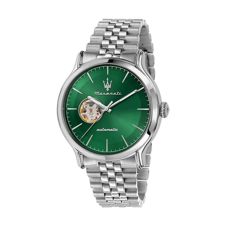 Maserati Epoca R8823118019 - a sleek gents automatic watch from the Epoca collection, featuring a stainless steel case and matte and polished bracelet with secure folding clasp. The striking green dial has small window allowing you to see the inner workings of the watch. Silver tone hands and hour markers, create a unique design perfect for any outfit.