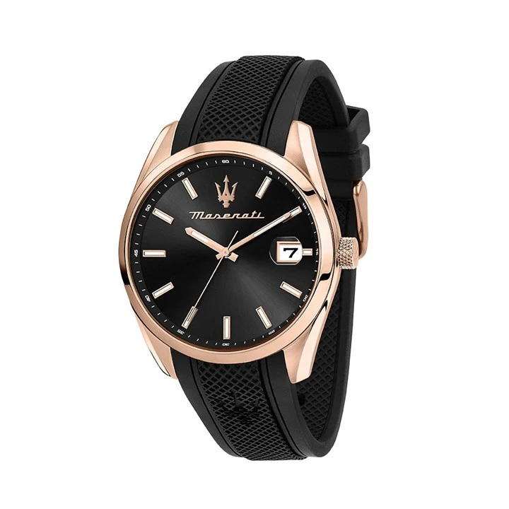 Maserati Attrazione R8851151002 - a smart gents watch from the Attrazione collection, featuring a rose gold tone stainless steel case and black silicone strap with traditional buckle. The black dial has rose gold tone hands and hour markers and a date display window, creating a funcational yet sleek design, perfect for any outfit.
