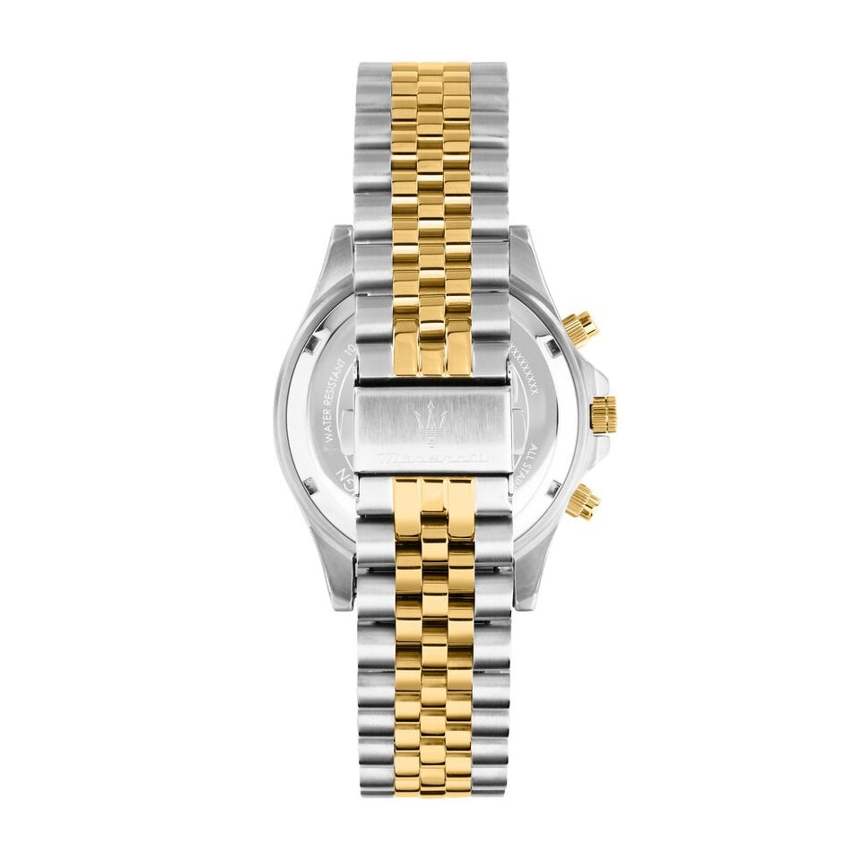 Maserati Sfida R8873640024 - a smart gents watch from the Sfida collection, featuring a two tone stainless steel case and bracelet with chic black bezel. The sleek silver chronograph dial is completed by gold tone hands and hour markers. A sporty looking watch for the car and watch lover.