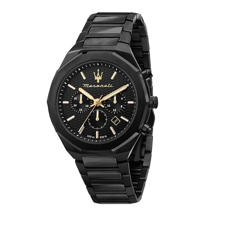 Maserati Stile R8873642005 - a striking gents watch from the Stile collection, featuring a black IP plated stainless steel case and bracelet with double push button folding clasp. The black chronograph dial has gold tone hands and hour markers and a date display window, creating a bold design perfect for any outfit.