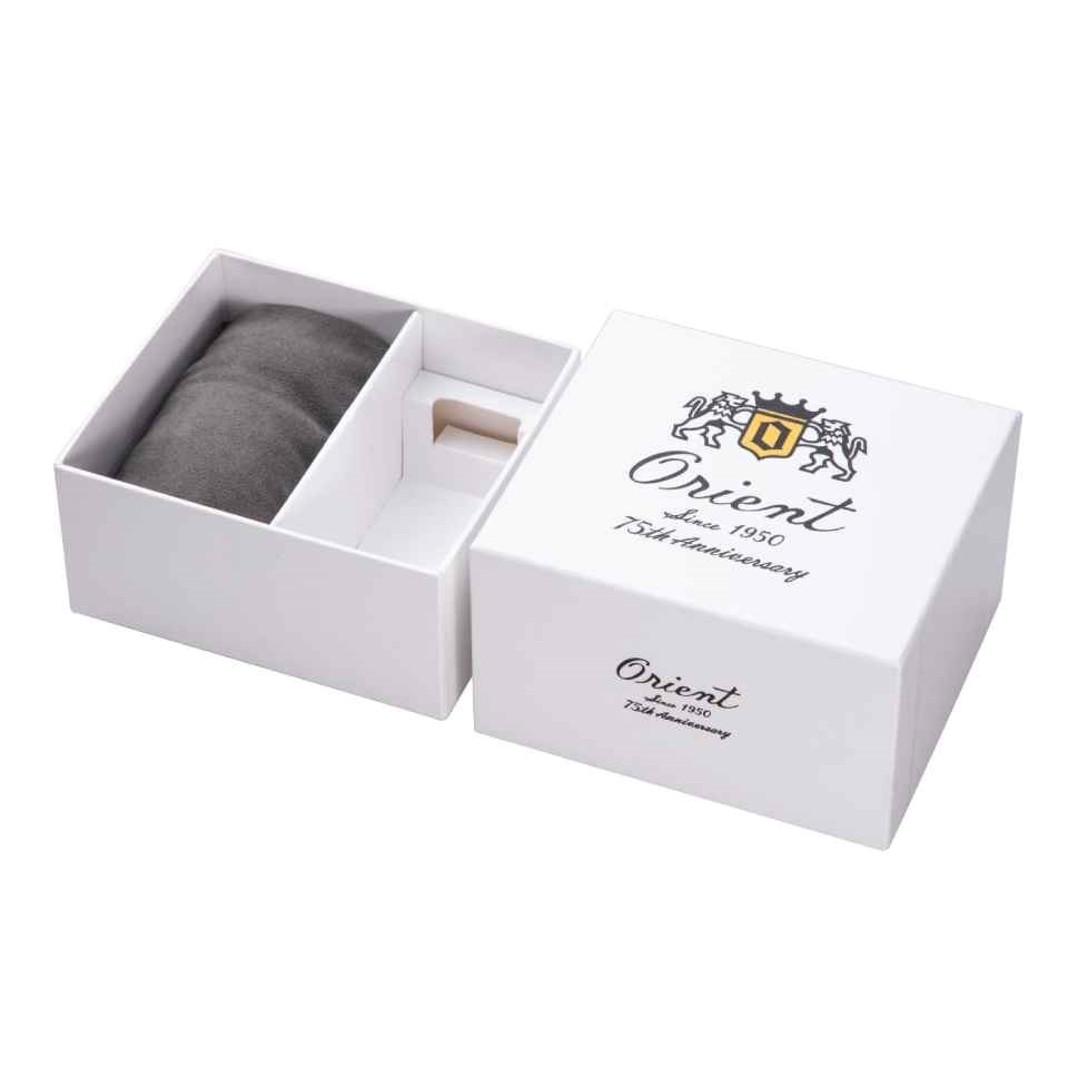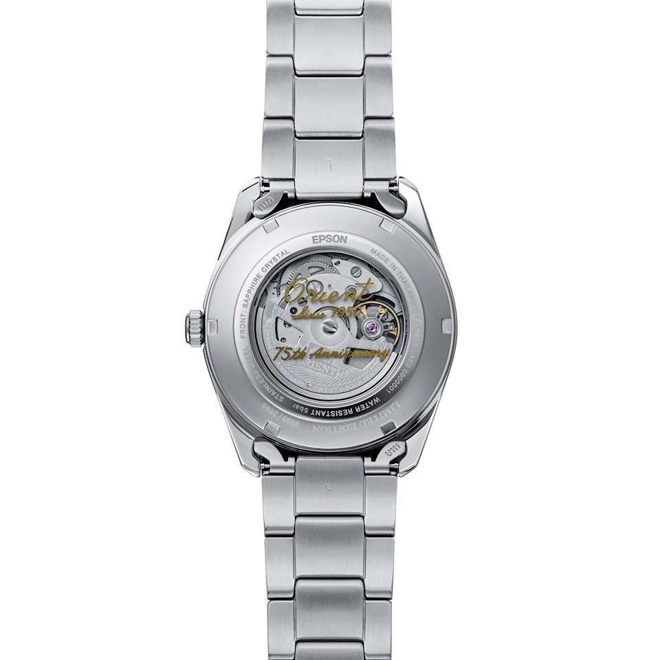 This model commemorates the brand’s 75th anniversary by showcasing the original Orient logo from 75 years ago in cursive on the dial, and a grey tone that enhances the overall look. In addition, the see-through case back revealing the mechanical movement is marked with a cursive inscription “Orient Since 1950 75th Anniversary” and individual serial numbers are also engraved on the back of the watch. The automatic (with hand winding) mechanical in-house calibre F6S22 movement is known for providing steady accuracy of +25 seconds to-15 seconds per day and a power reserve of 40 hours. This is a practical mechanical watch that is ideal for daily use. 50m water resistant.