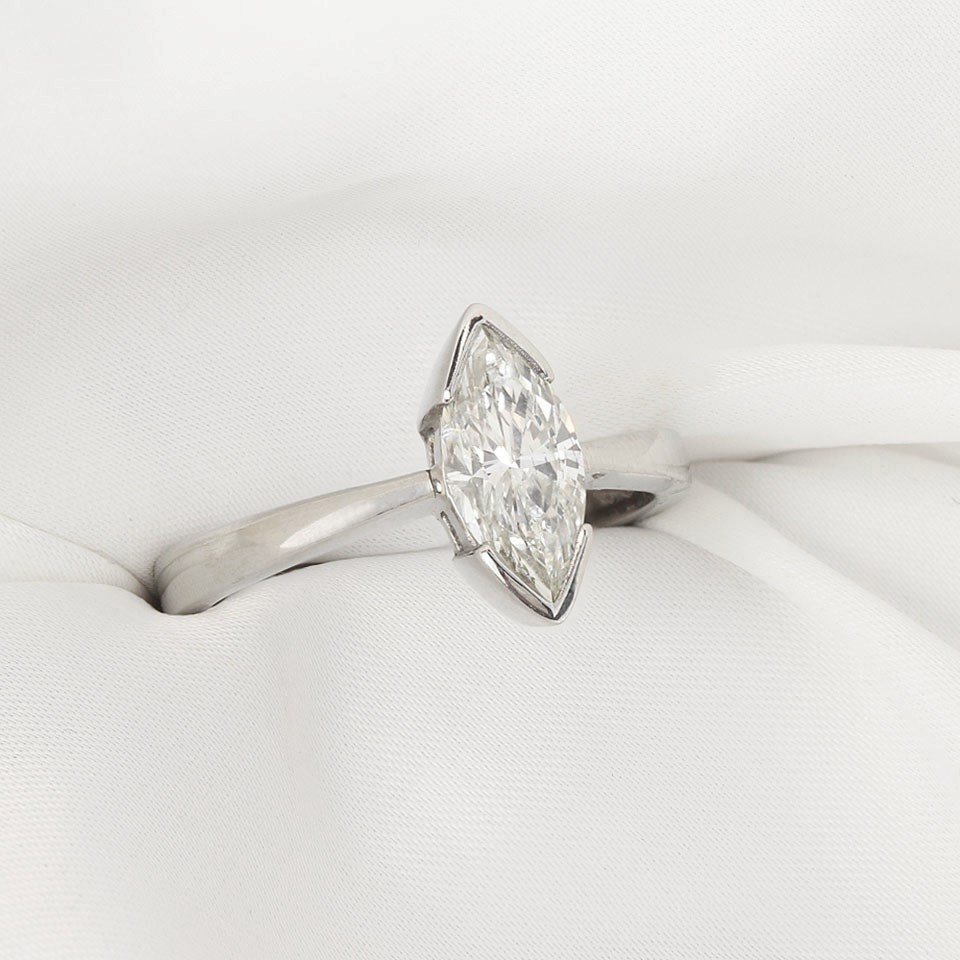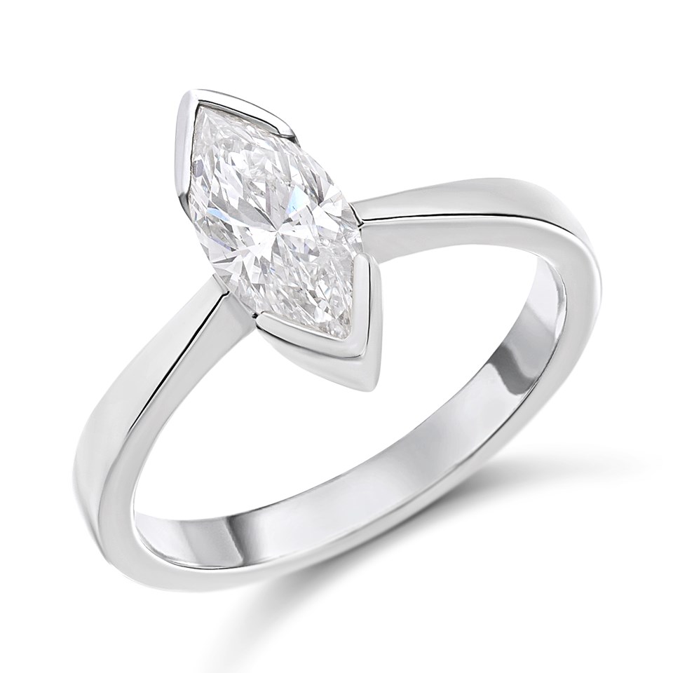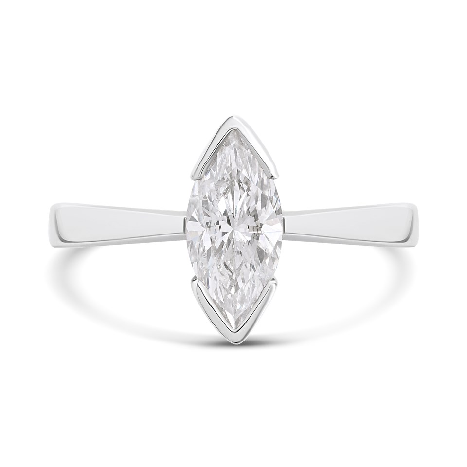 Celebrate your love with the stunning Solitaire Diamond Engagement Ring, a symbol of timeless elegance and commitment. Featuring a single, marquise cut diamond, this classic design is crafted to perfection in our UK workshop. The polished platinum solitaire setting elegantly showcases the diamond, allowing its natural sparkle to shine through with every movement.