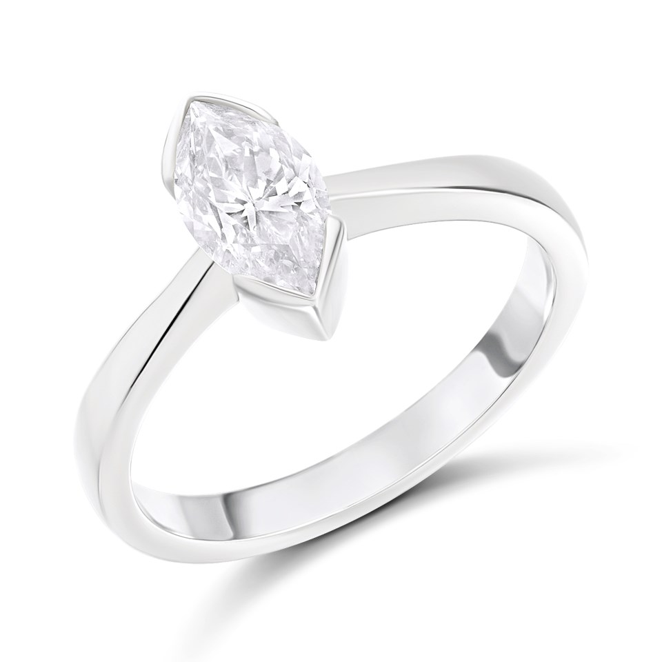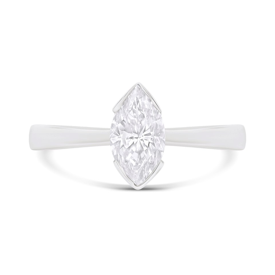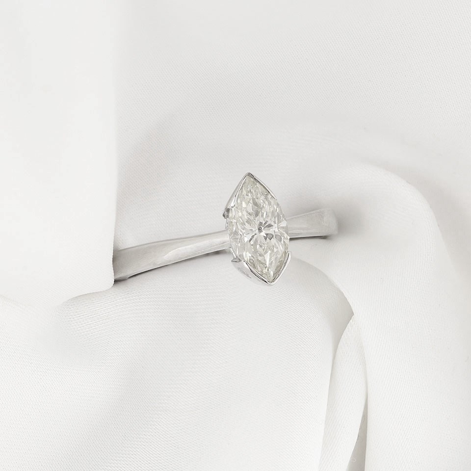 Celebrate your love with the stunning Solitaire Diamond Engagement Ring, a symbol of timeless elegance and commitment. Featuring a single, marquise cut diamond, this classic design is crafted to perfection in our UK workshop. The polished platinum solitaire setting elegantly showcases the diamond, allowing its natural sparkle to shine through with every movement.