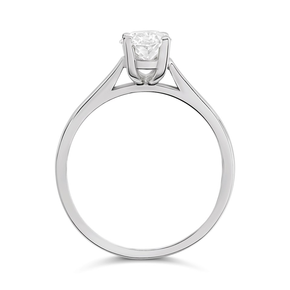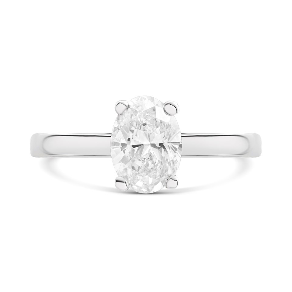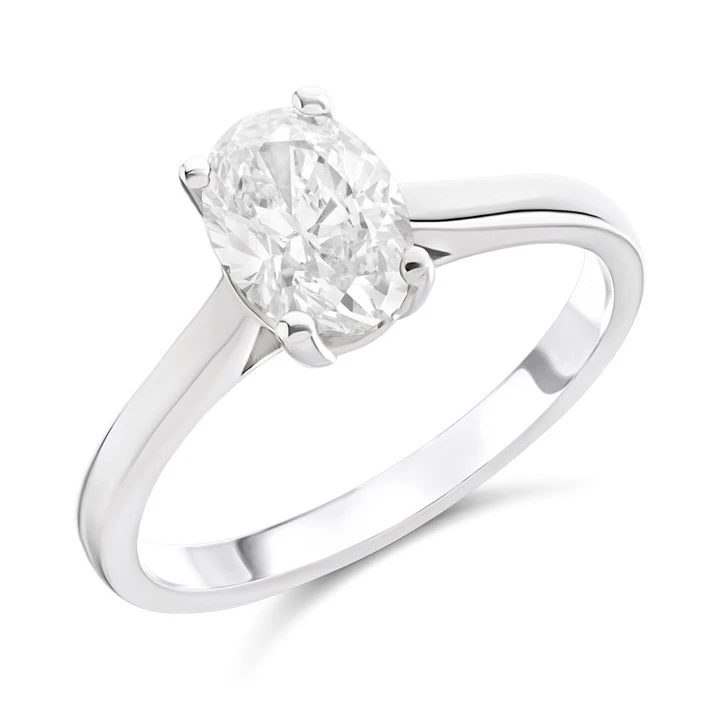 Celebrate your love with the stunning Solitaire Diamond Engagement Ring, a symbol of timeless elegance and commitment. Featuring a single, oval cut diamond, this classic design is crafted to perfection in our UK workshop. The polished platinum solitaire setting elegantly showcases the diamond, allowing its natural sparkle to shine through with every movement.