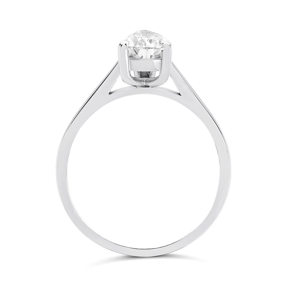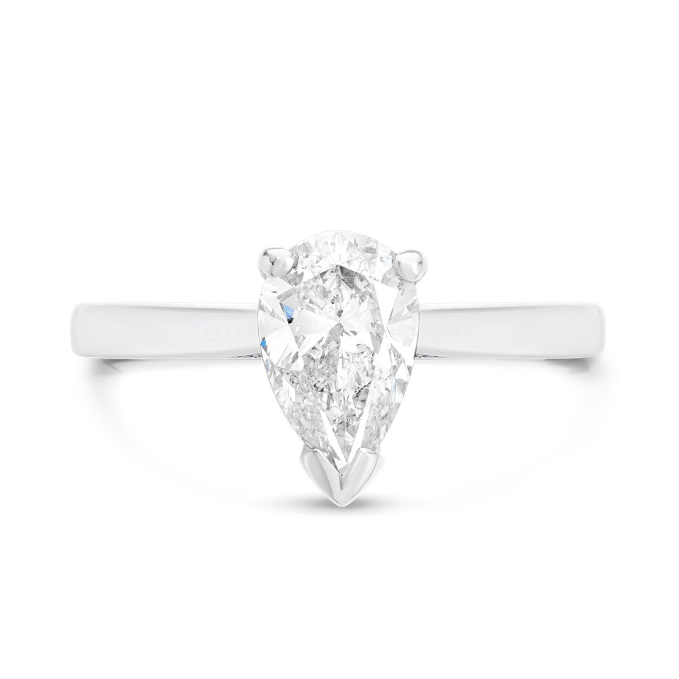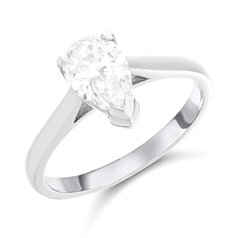 Celebrate your love with the stunning Solitaire Diamond Engagement Ring, a symbol of timeless elegance and commitment. Featuring a single, pear cut diamond, this classic design is crafted to perfection in our UK workshop. The polished platinum solitaire setting elegantly showcases the diamond, allowing its natural sparkle to shine through with every movement.
