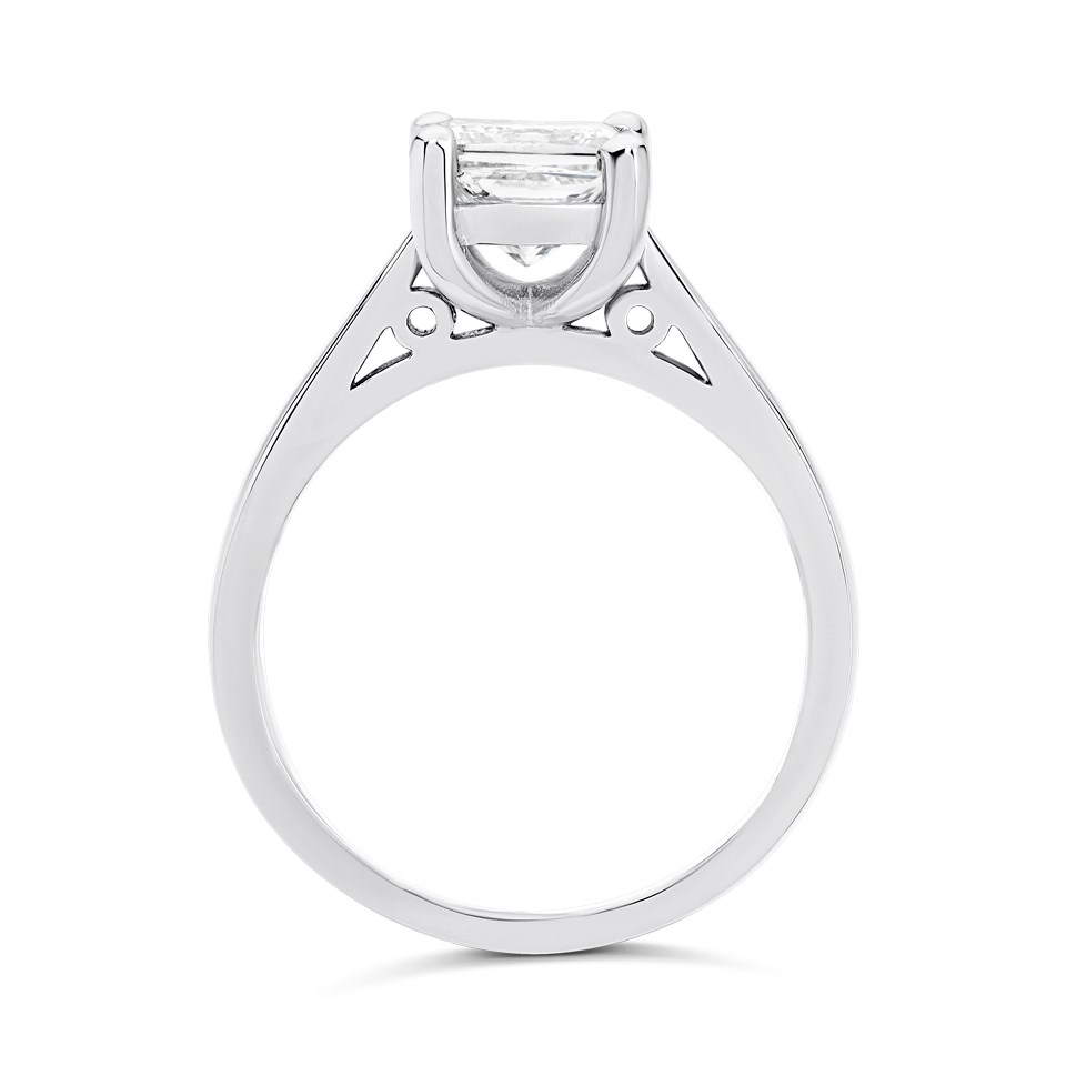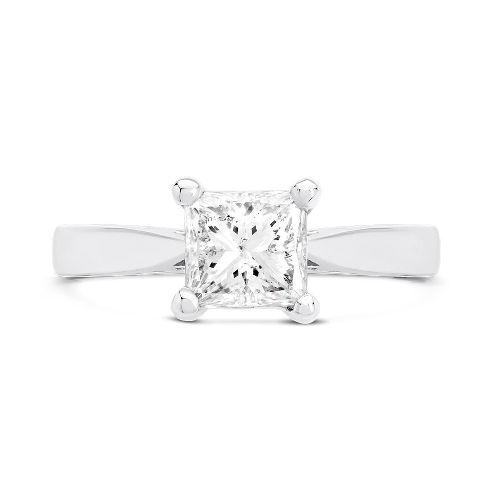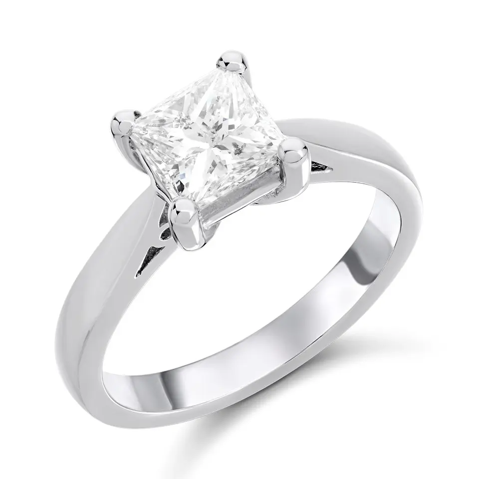 Celebrate your love with the stunning Solitaire Diamond Engagement Ring, a symbol of timeless elegance and commitment. Featuring a single, princess cut diamond, this classic design is crafted to perfection in our UK workshop. The polished platinum solitaire setting elegantly showcases the diamond, allowing its natural sparkle to shine through with every movement.