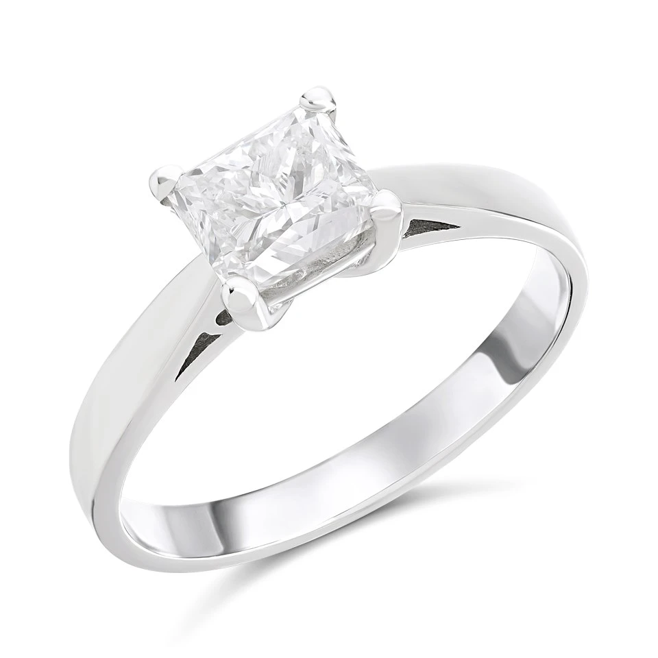 Celebrate your love with the stunning Solitaire Diamond Engagement Ring, a symbol of timeless elegance and commitment. Featuring a single, princess cut diamond, this classic design is crafted to perfection in our UK workshop. The polished platinum setting elegantly showcases the diamond, allowing its natural sparkle to shine through with every movement.