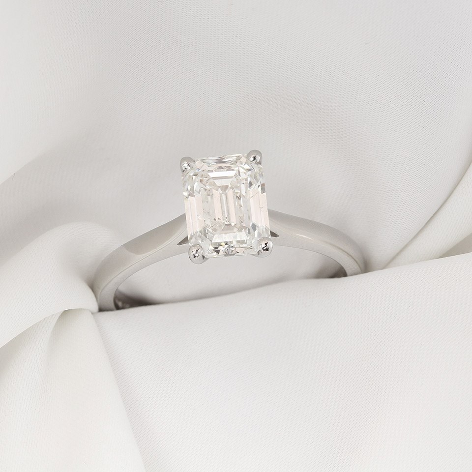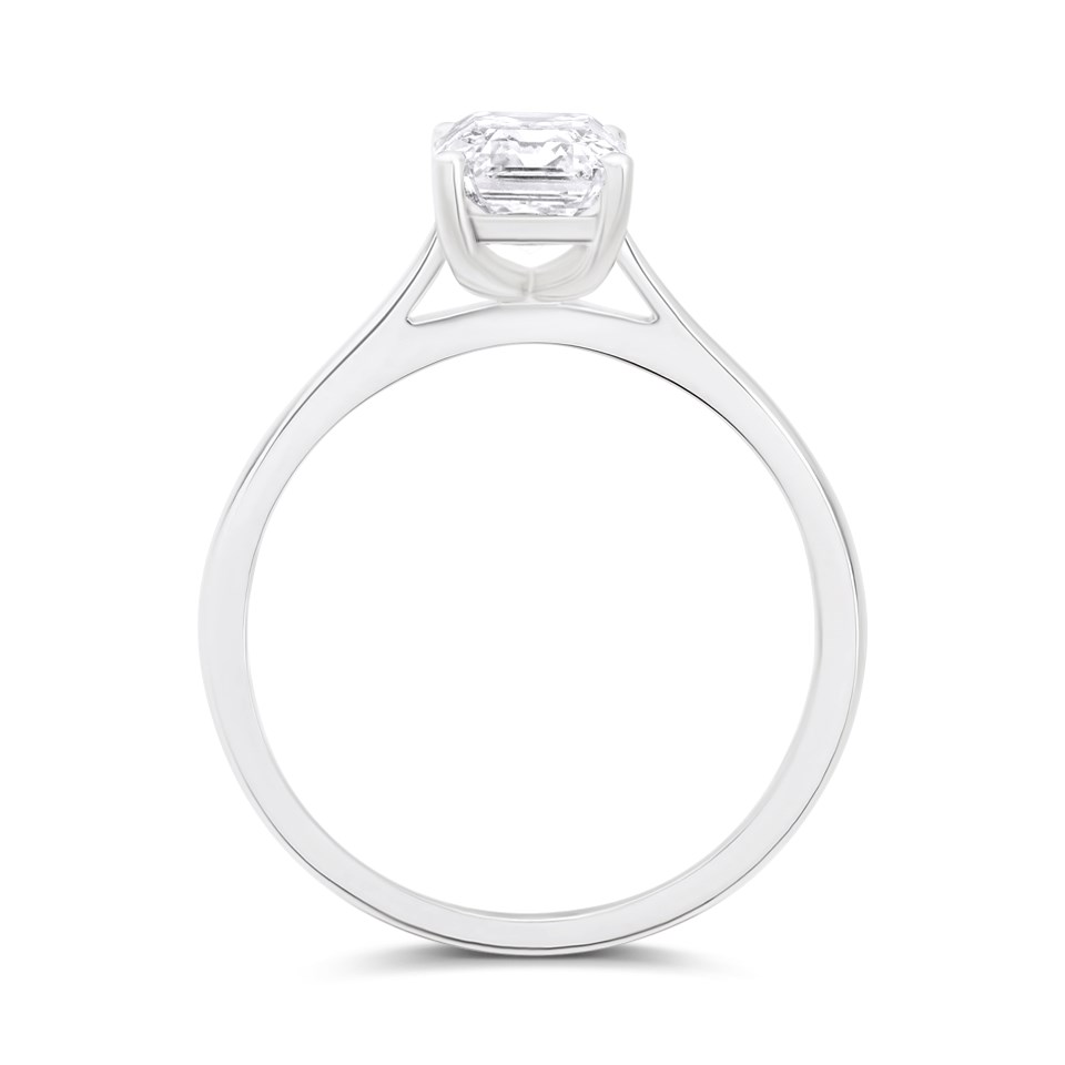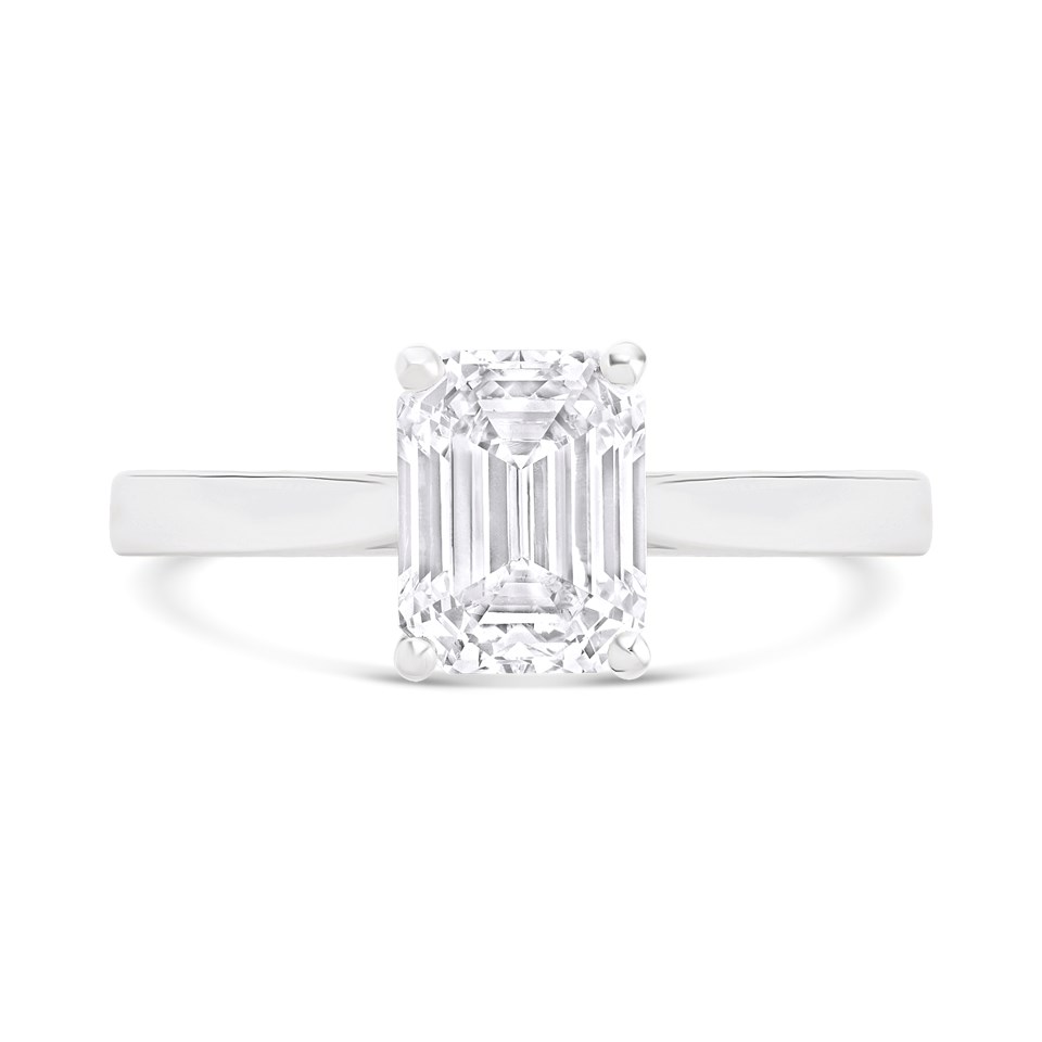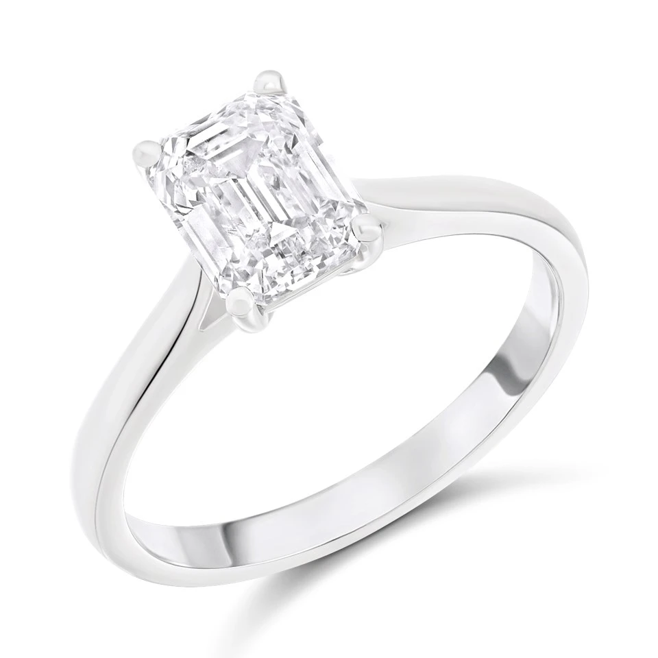 Celebrate your love with the stunning Solitaire Diamond Engagement Ring, a symbol of timeless elegance and commitment. Featuring a single, emerald cut diamond, this classic design is crafted to perfection in our UK workshop. The polished platinum solitaire setting elegantly showcases the diamond, allowing its natural sparkle to shine through with every movement.